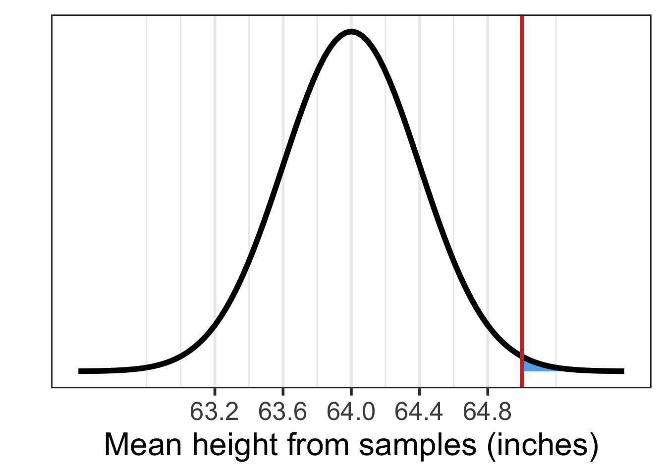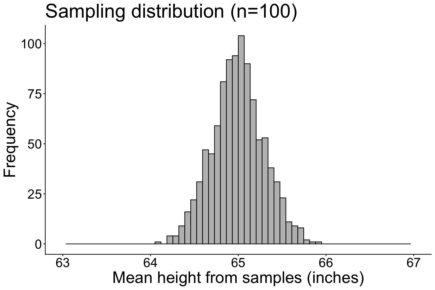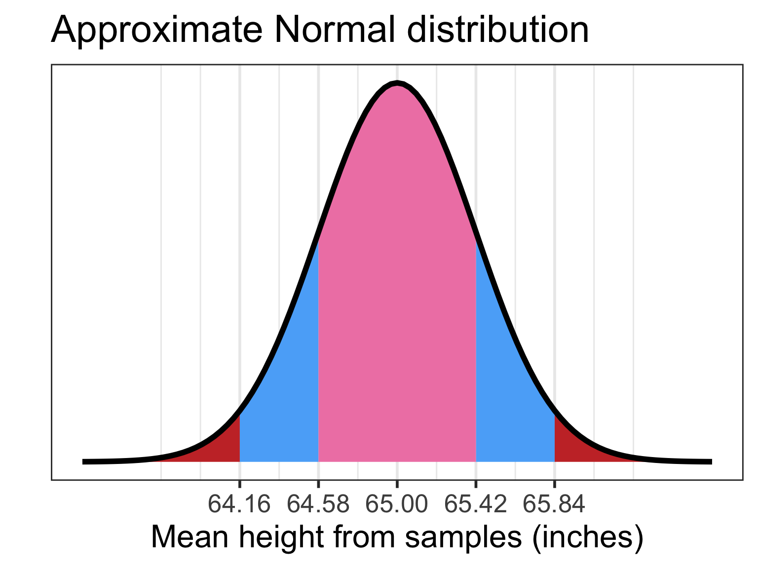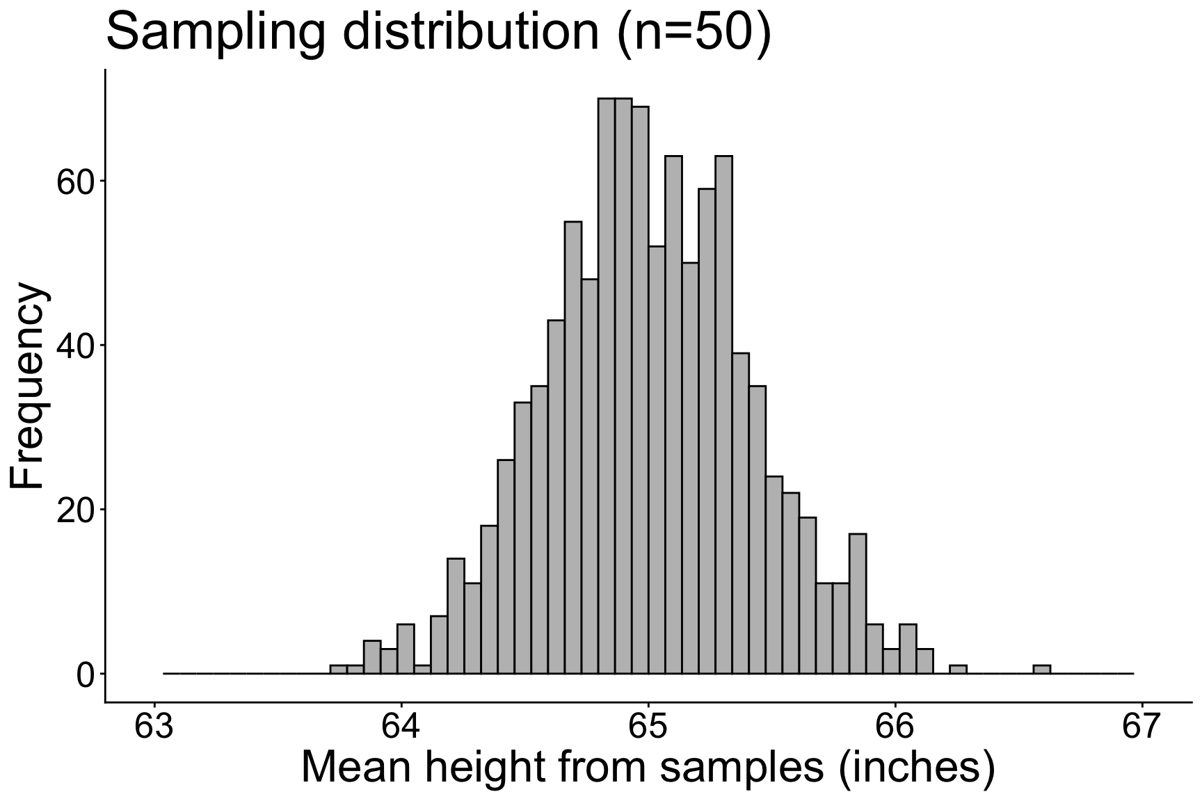 \[ \mu_{\overline{X}} = 65.002 \text{ inches}\] \[ SE = 0.421 \text{ inches}\]