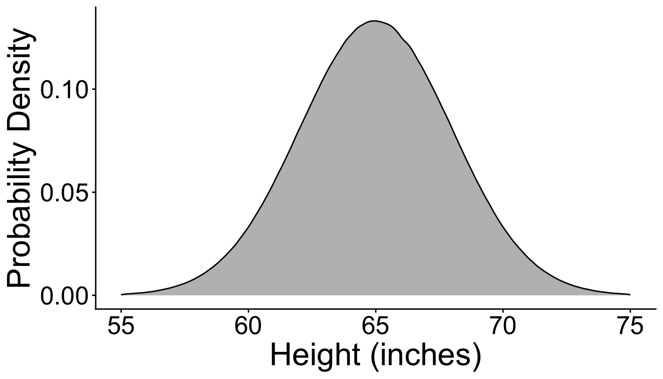 Mean and SD of population: \[ \mu = 65 \text{ inches} \text{, } \sigma = 3 \text{ inches}\]