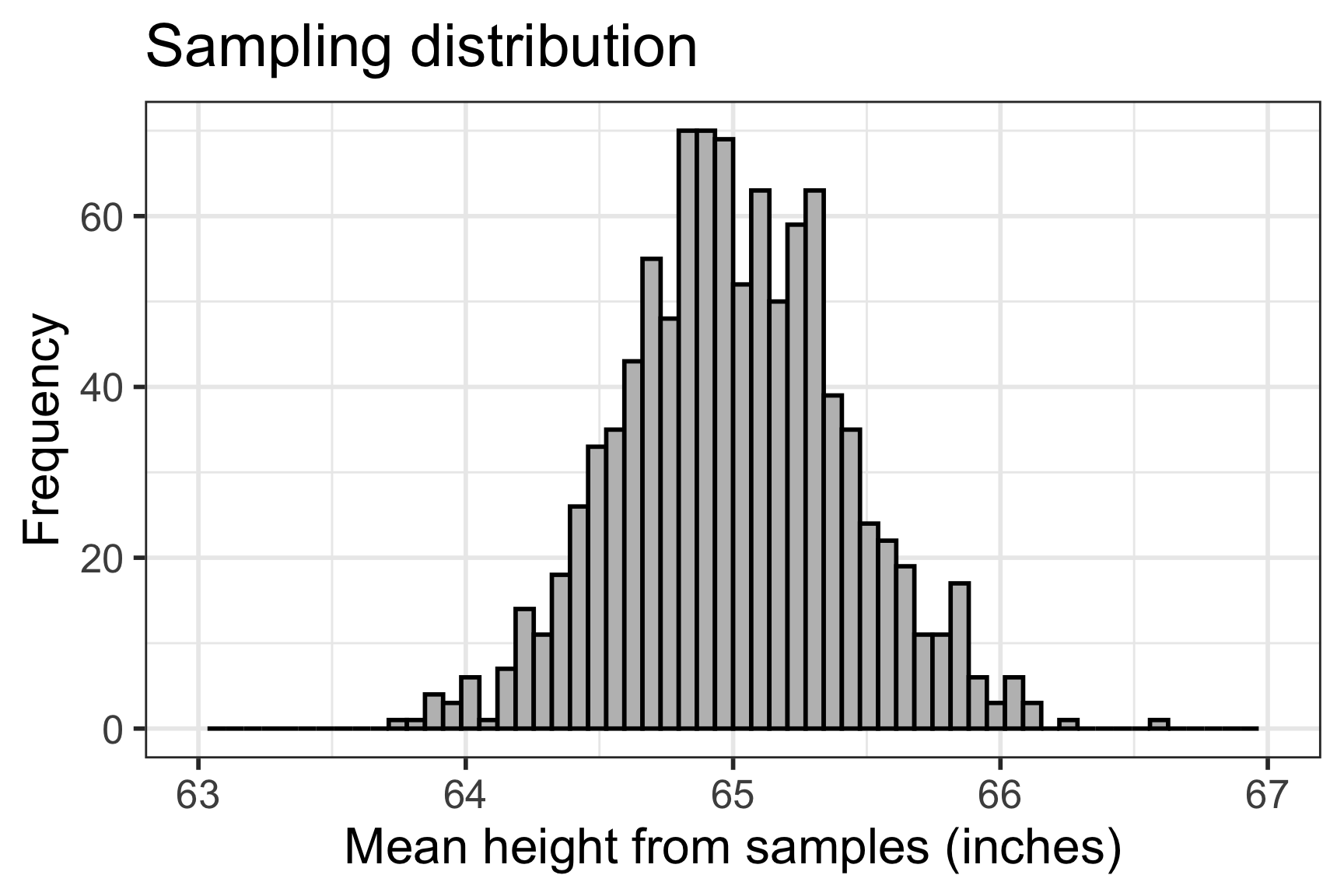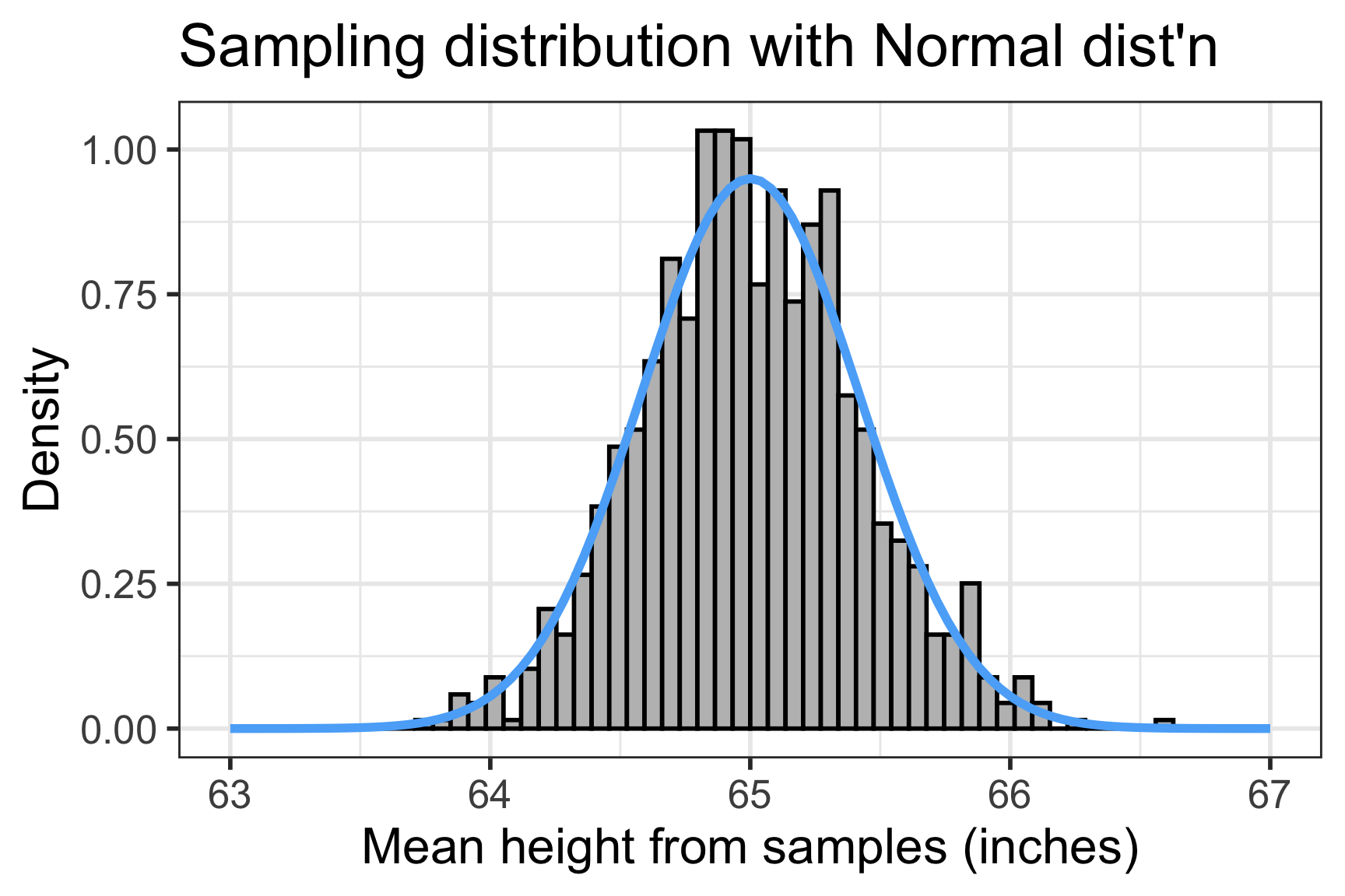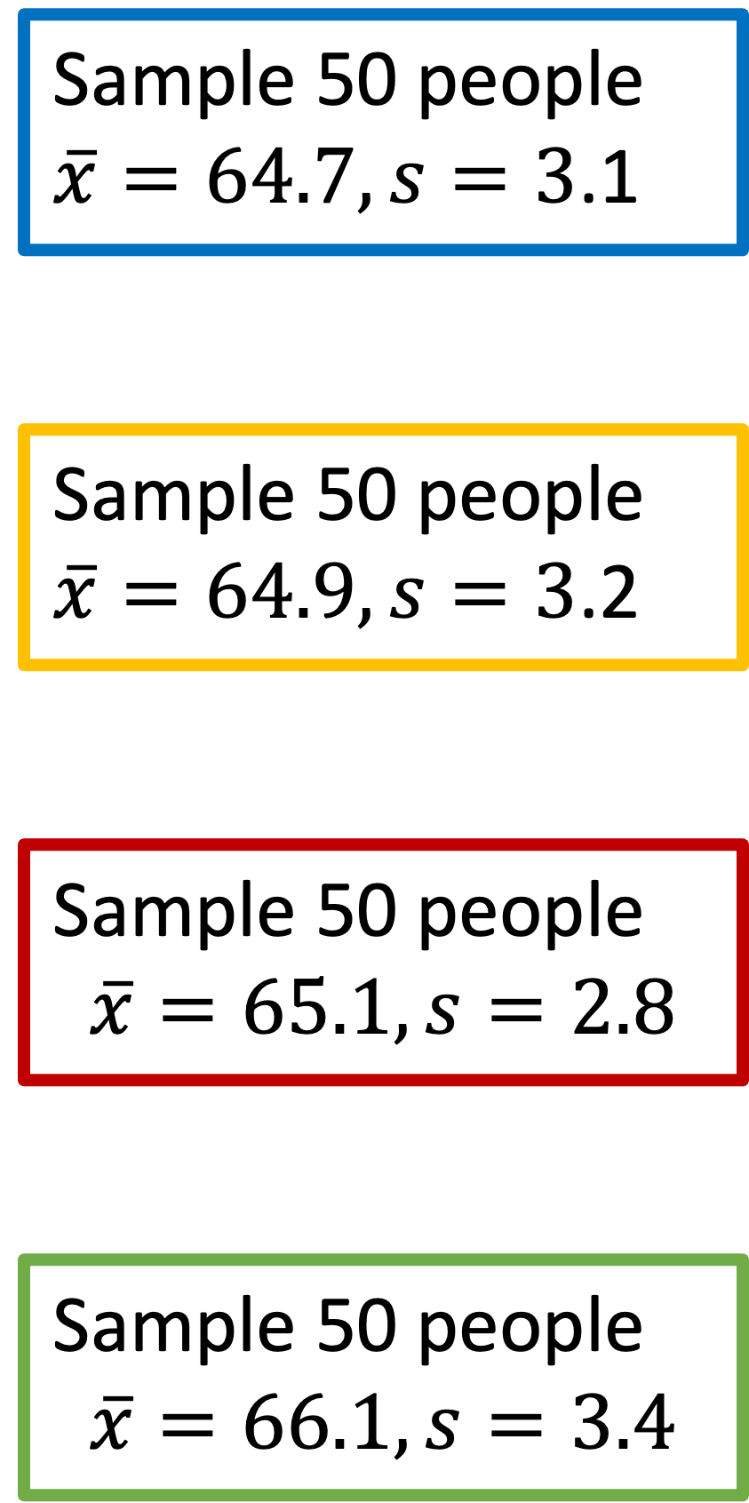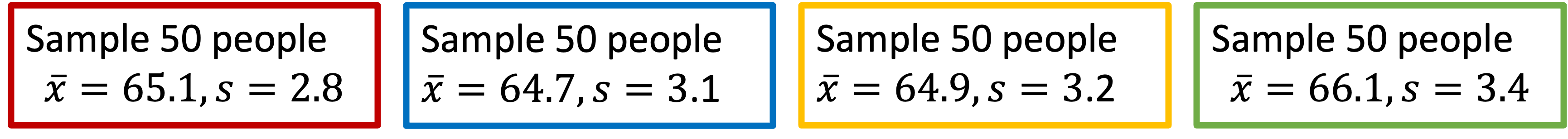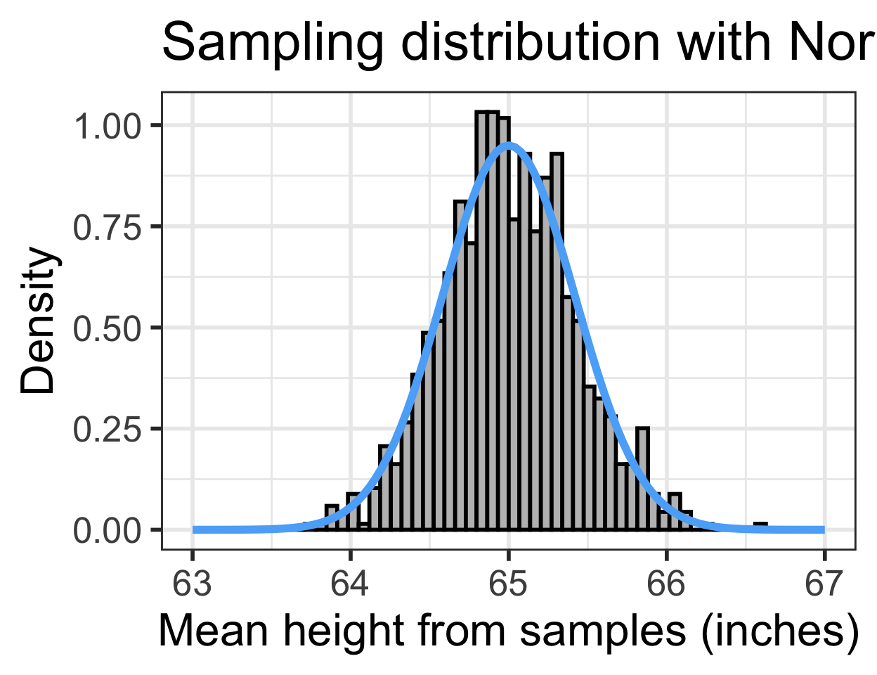 \[ \mu_{\overline{X}} = 65 \text{ inches}\] \[ SE = 0.424 \text{ inches}\]