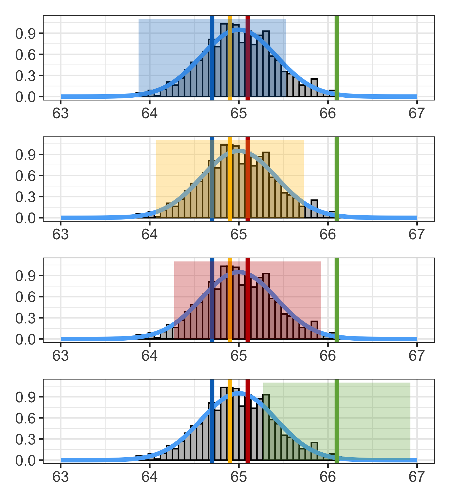 \[\overline{X} \sim \text{Normal}\big(\mu_{\overline{X}}=65, SE = 0.424 \big)\]