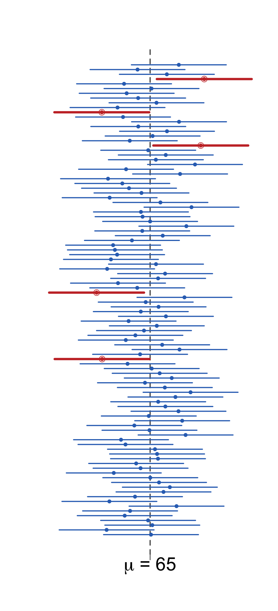 We can create a plausible range of values for a population mean (\(\mu\)) from a sample’s mean \(\overline{x}\)