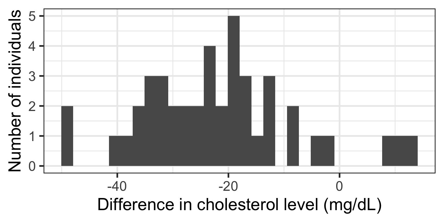 \[\begin{aligned} H_0 :& \text{The population mean difference in cholesterol levels after a vegetarian diet is zero}\\ \text{vs. } H_A :& \text{The population mean difference in cholesterol levels after a vegetarian diet is} \\ & \text{ different than zero} \end{aligned}\]Notation for hypotheses (for paired data)