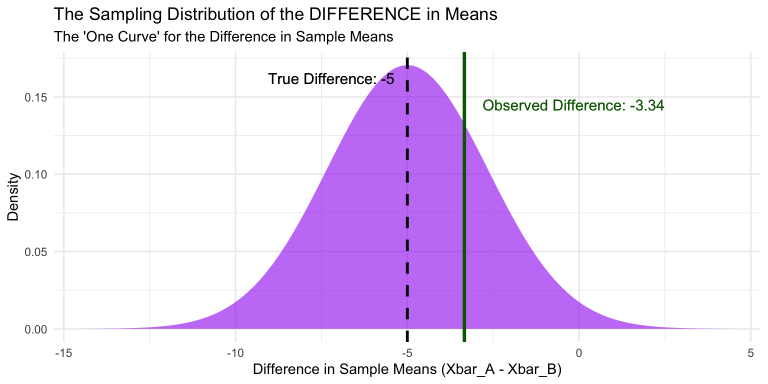subtitle = "The 'One Curve' for the Difference in Sample Means",