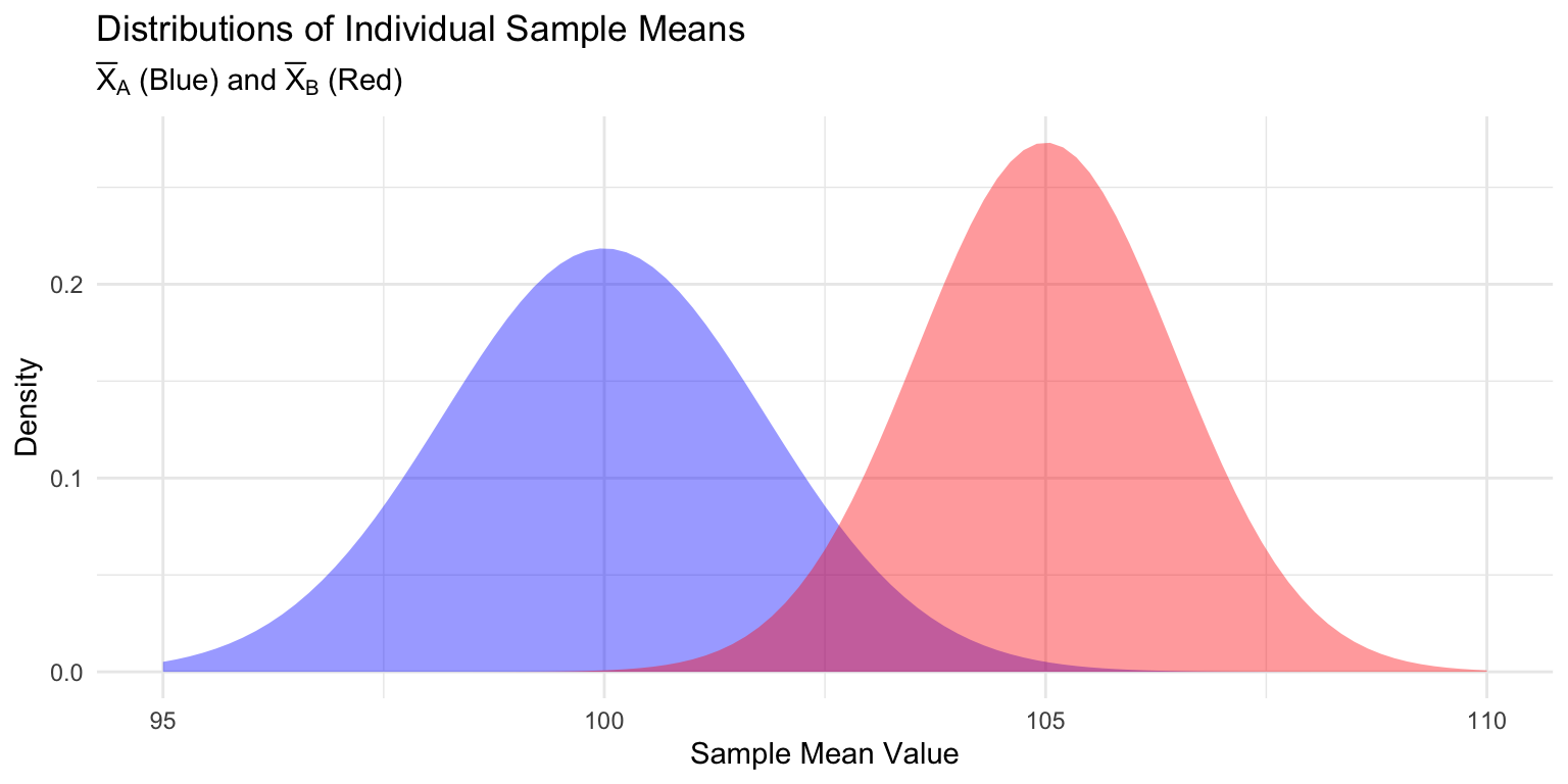 - We collect two samples and calculate their means, \(\bar{X}_A\) and \(\bar{X}_B\).