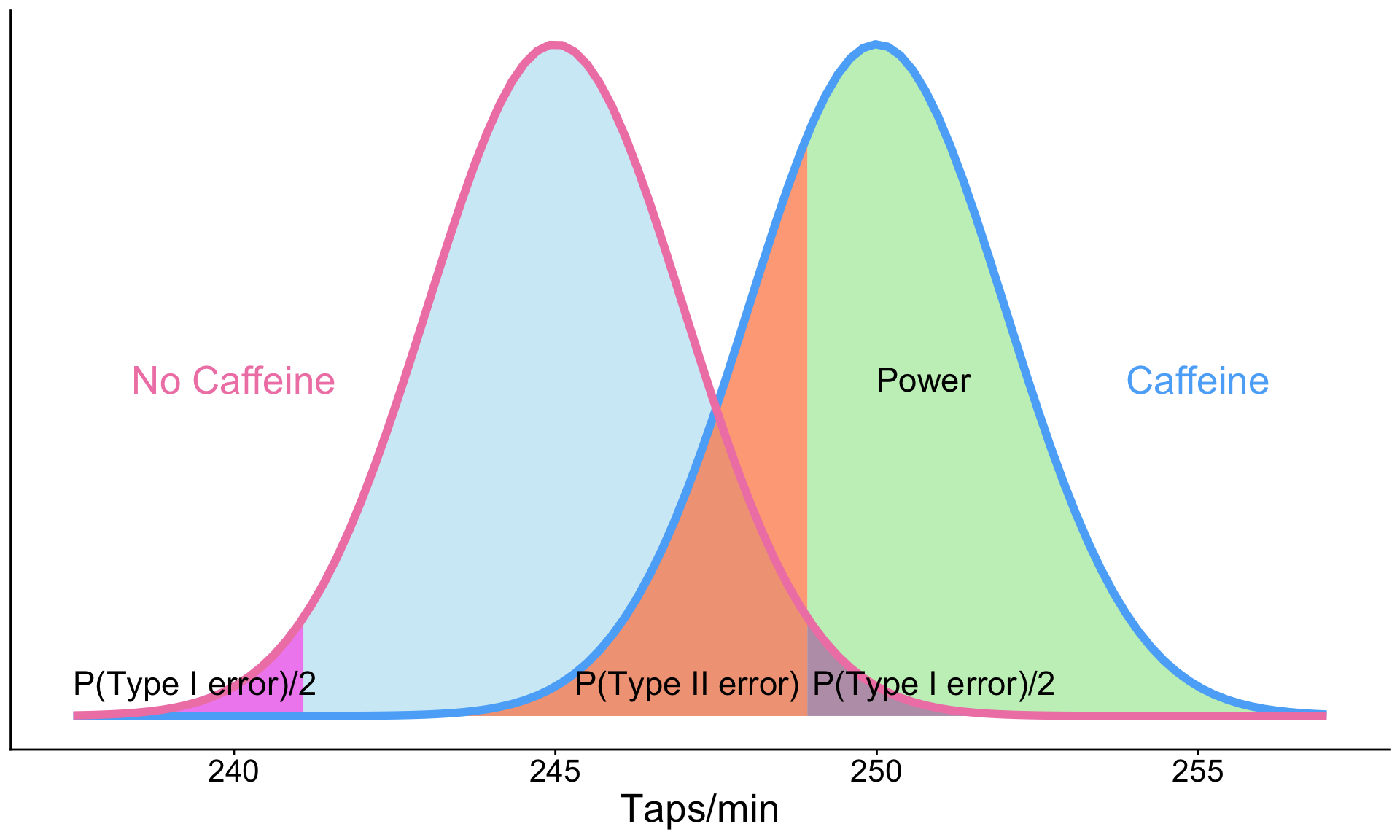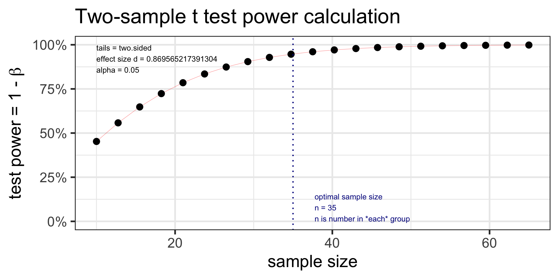 pwr: Two-sample t-test: powerExample: Let’s revisit our caffeine taps study. Investigators want to know what power they have to detect a 2 point difference between the two groups. The two groups are both size 35 (like in our previous example). Assume the SD in both group samples is 2.6.