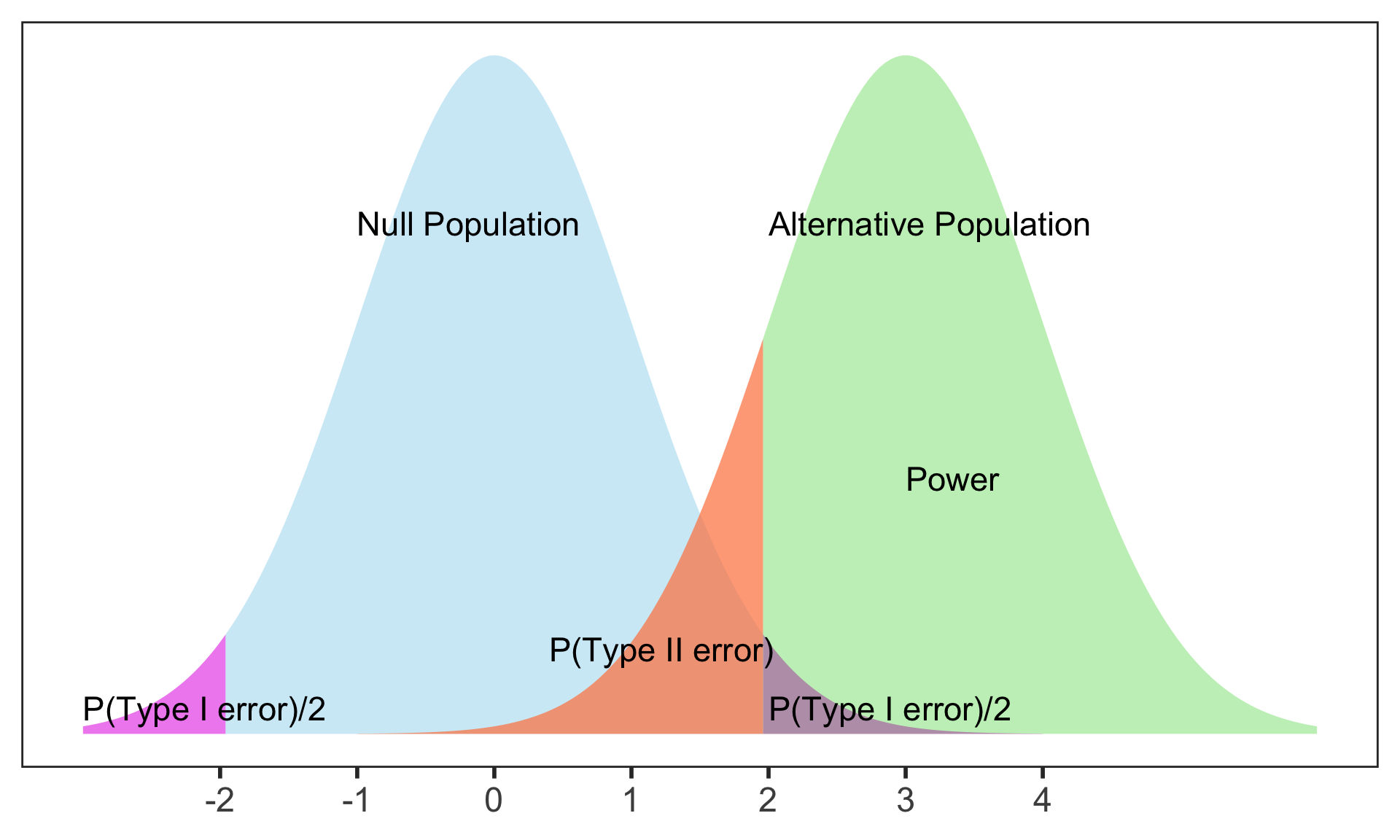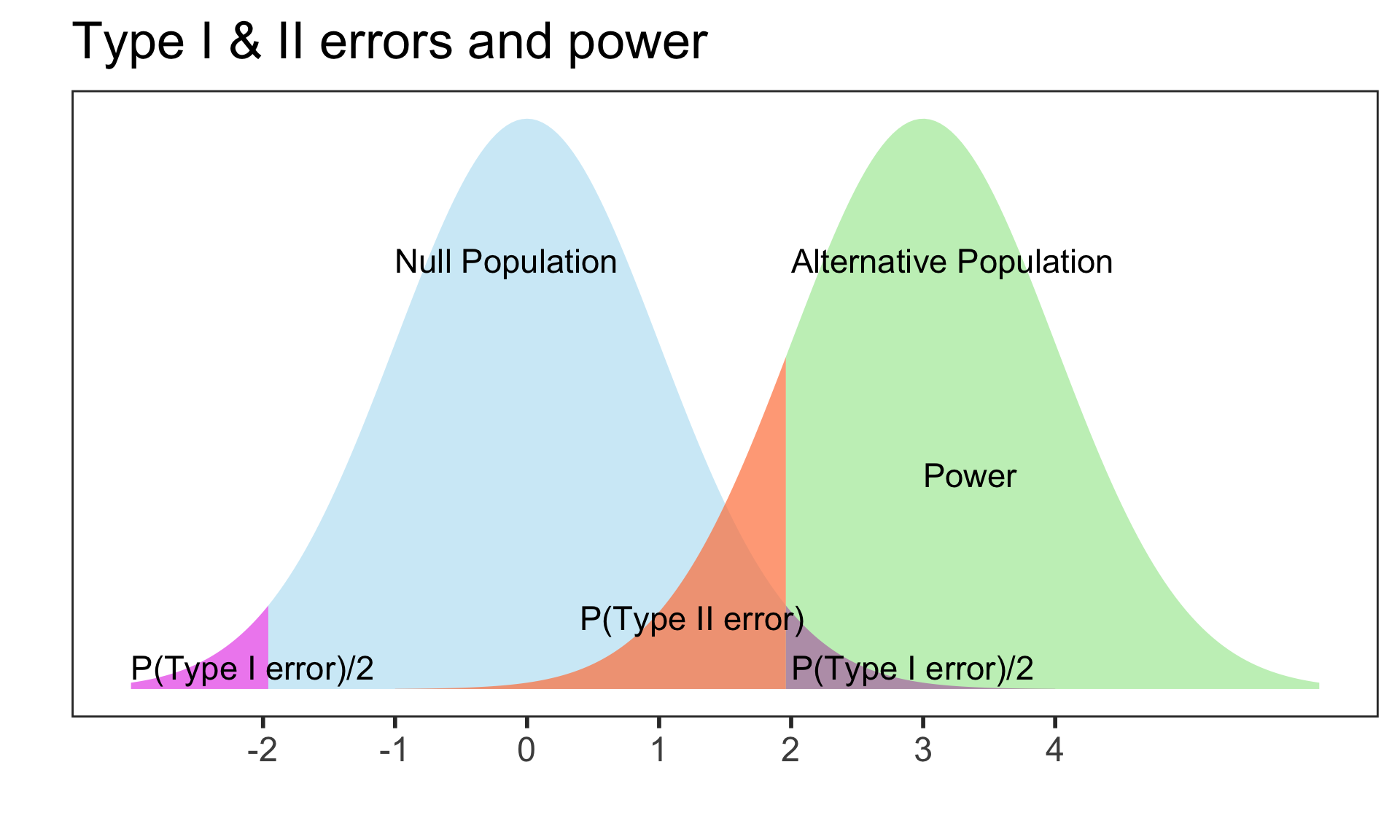 Power (or sensitivity) (\(1 - \beta\)): Probability of rejecting the null hypothesis given that the null is false (correct)