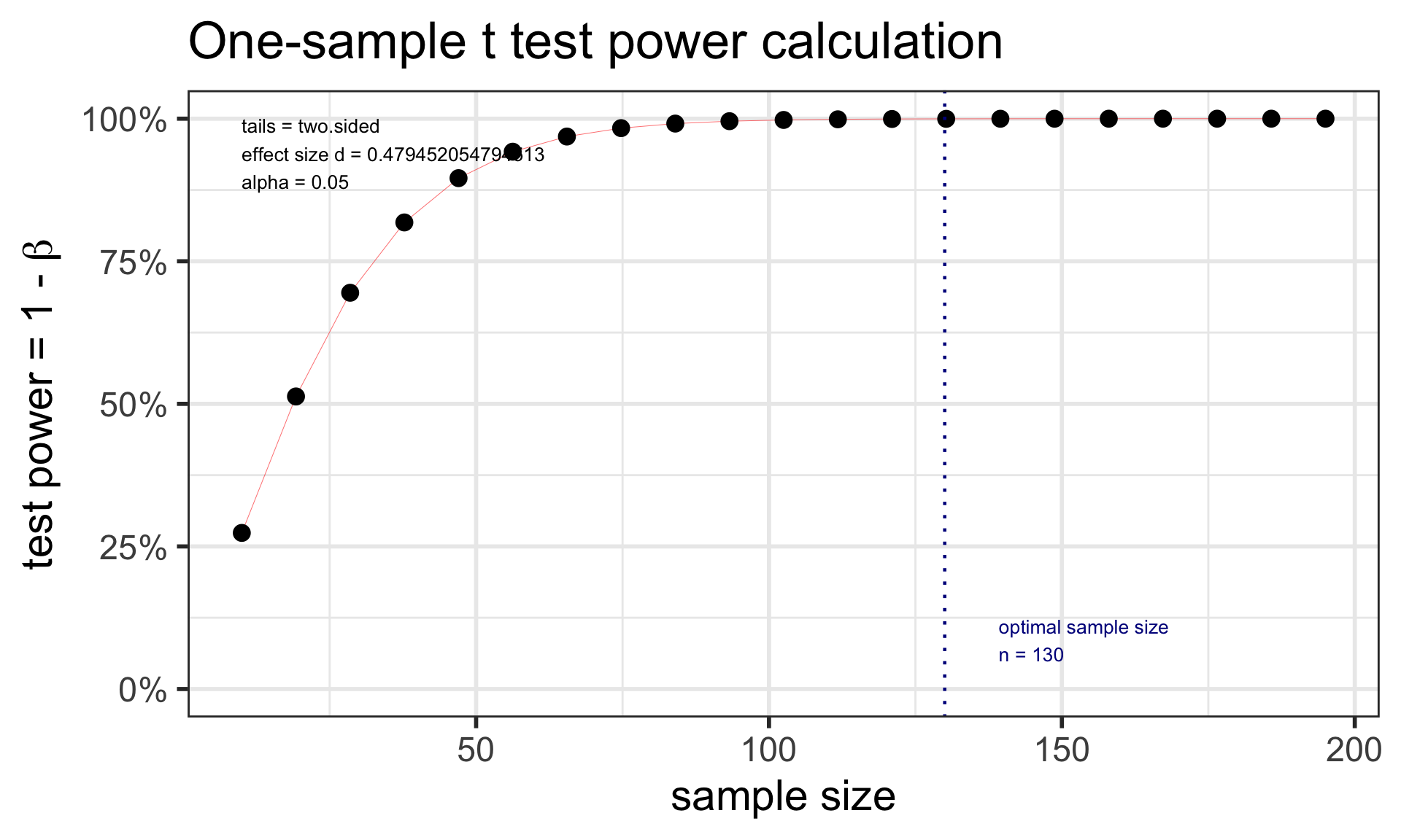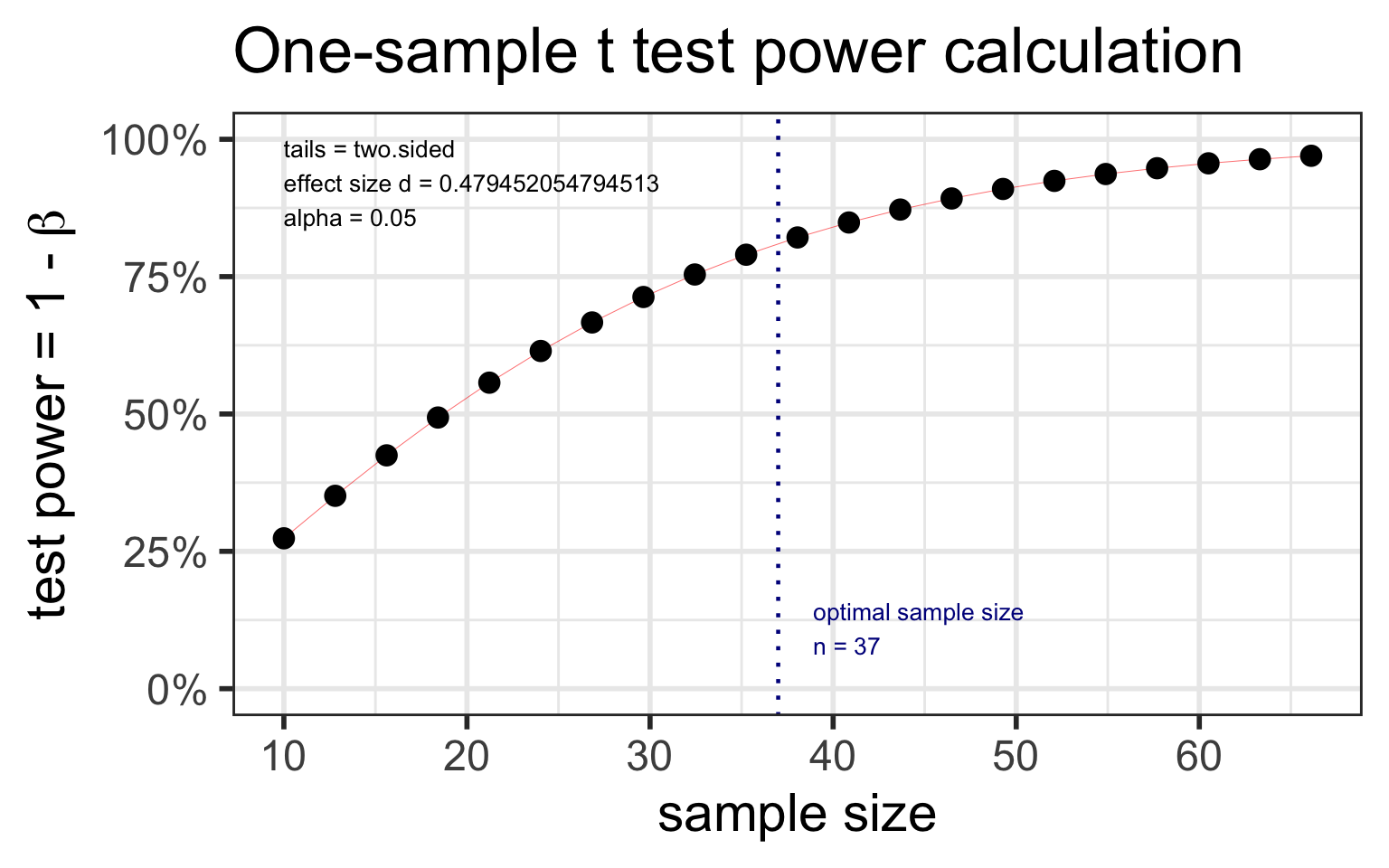 d: \[d = \frac{\overline{x}-\mu_0}{s}\]pwr: sample size for one mean testSpecify all parameters except for the sample size: