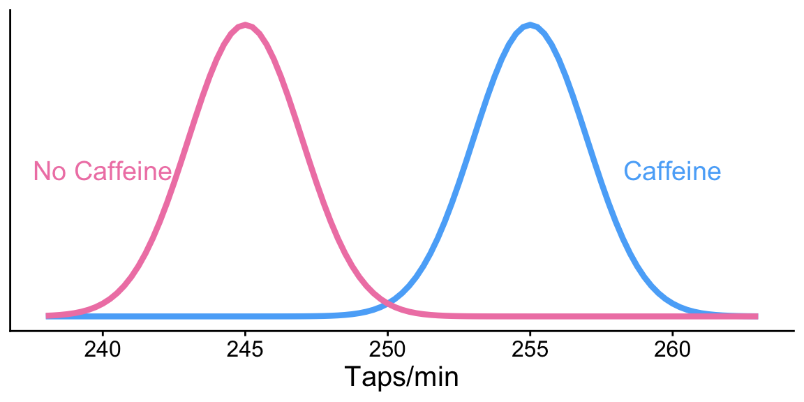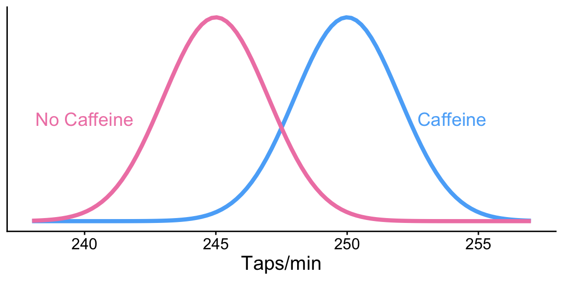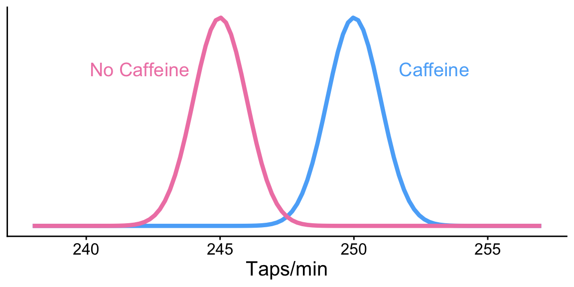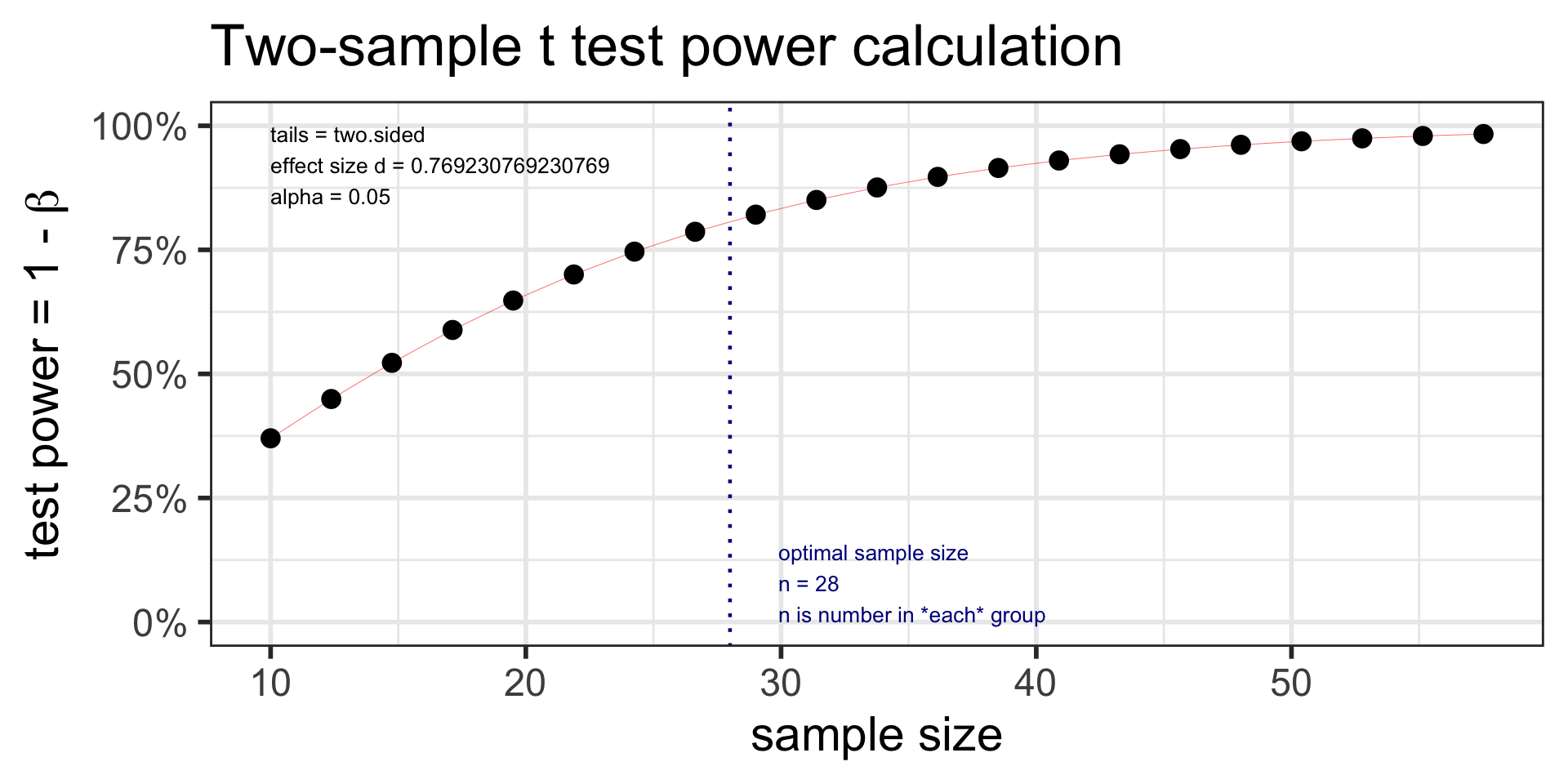 pwr: Two-sample t-test: sample sizeExample: Let’s revisit our caffeine taps study. Investigators want to know what sample size they would need to detect a 2 point difference between the two groups. Assume the SD in both group samples is 2.6.