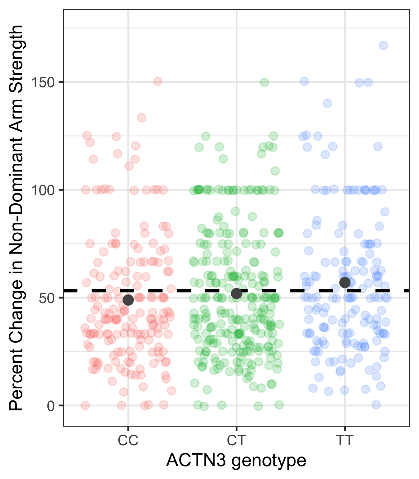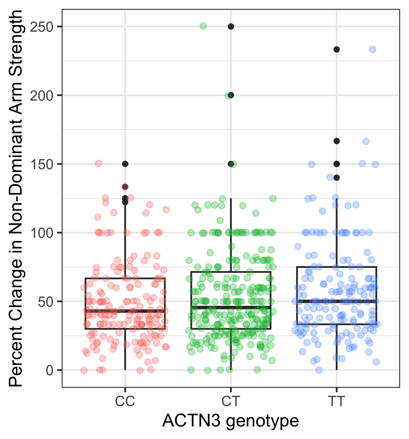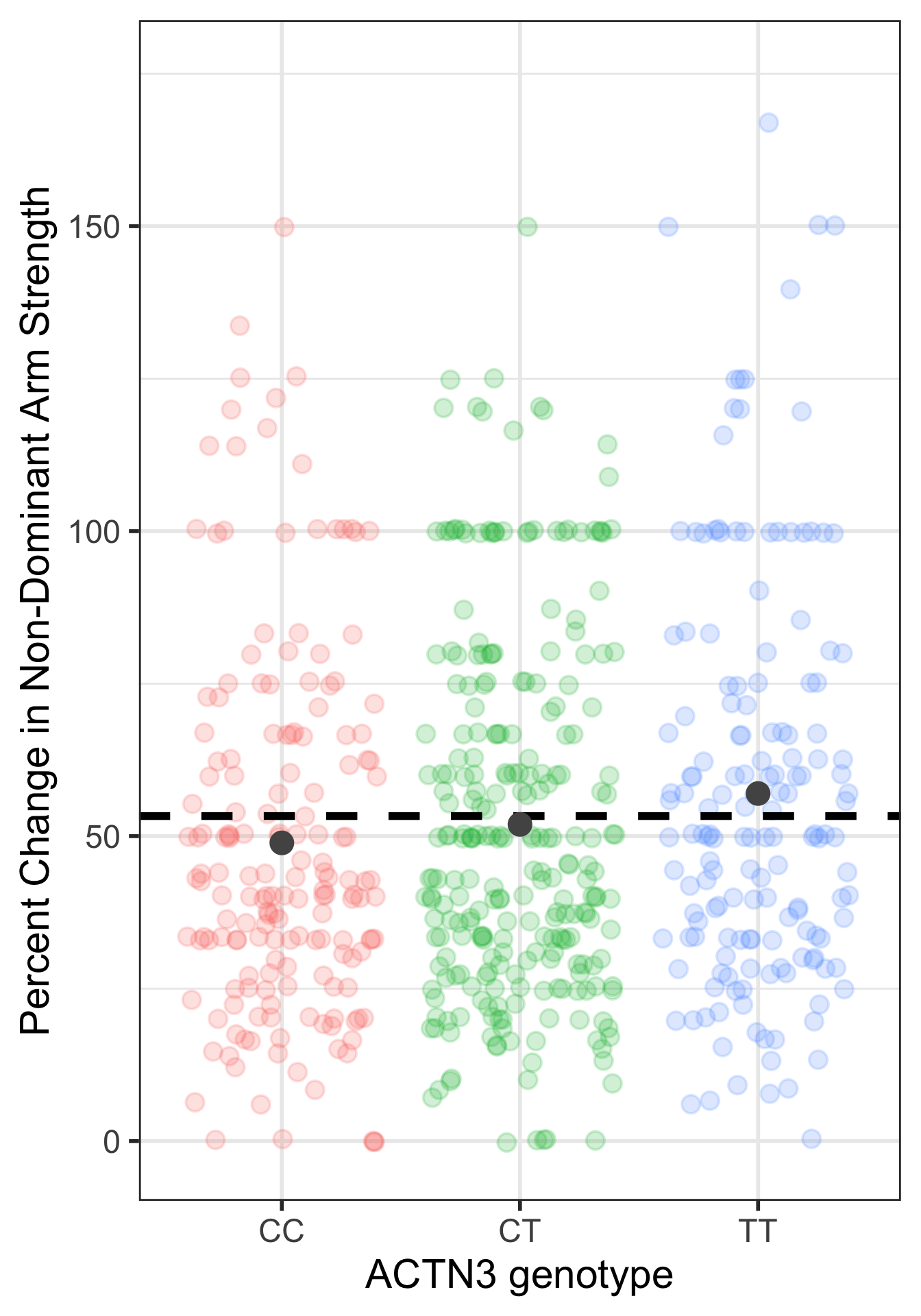 This is the case that I would also do some work to report the means and standard deviations of each genotype’s percent change in non-dominant arm strength.