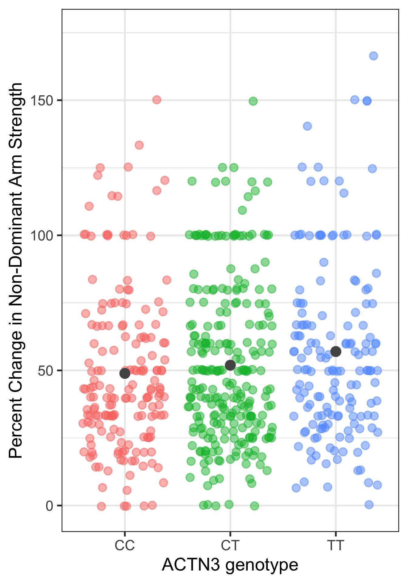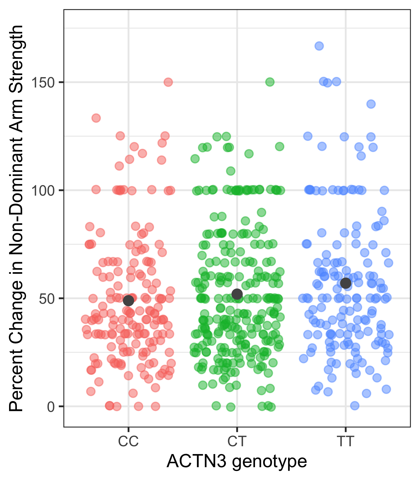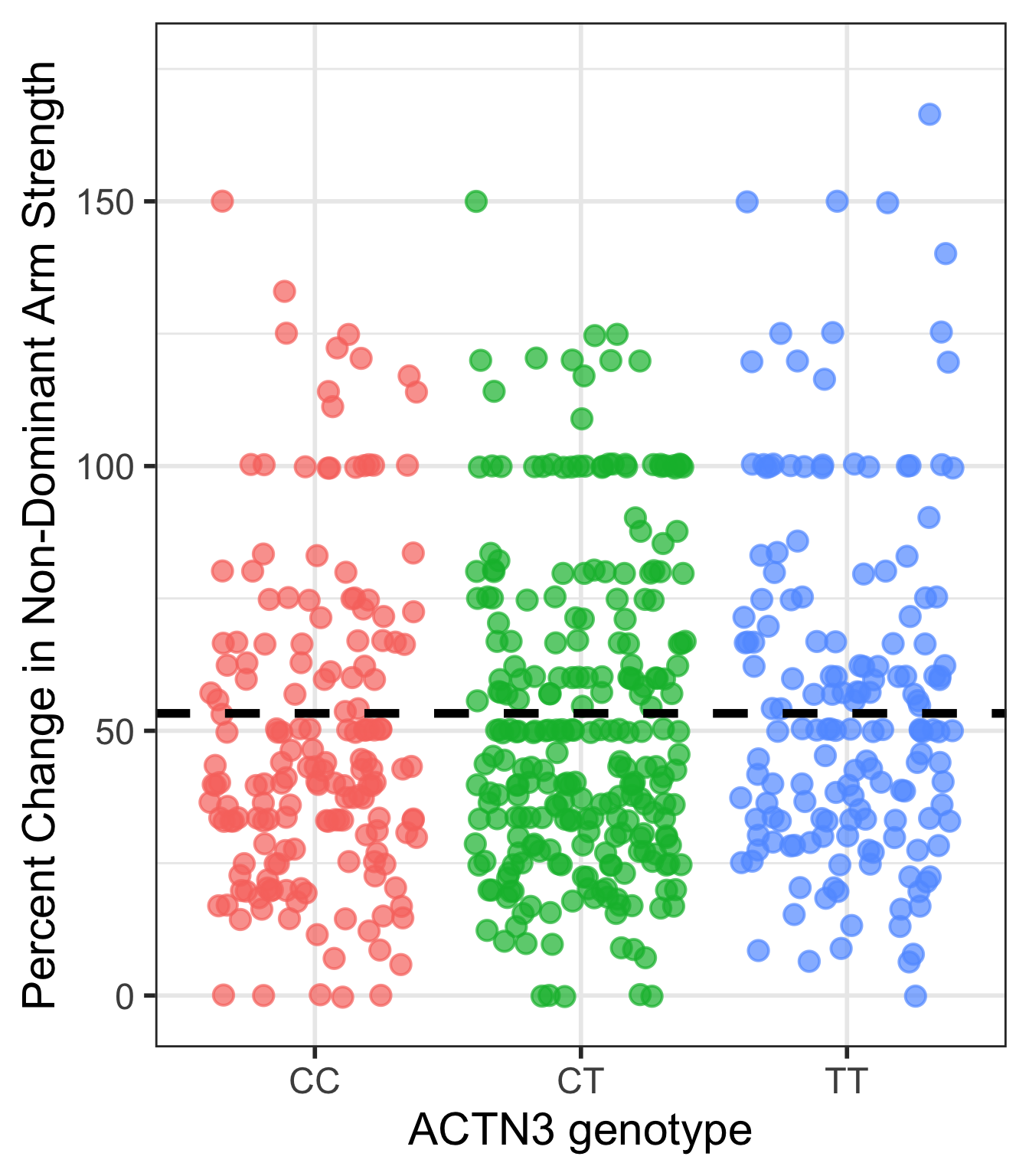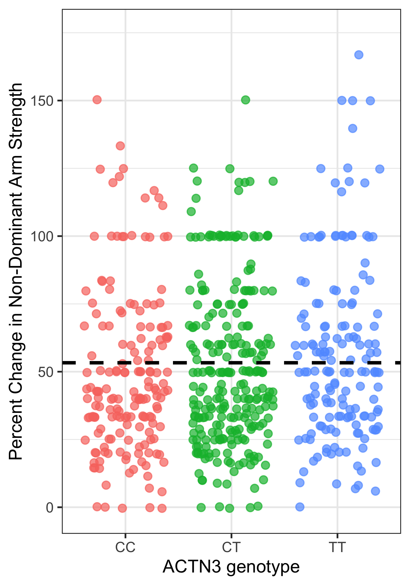 This is the case that I would also do some work to report the means and standard deviations of each genotype’s percent change in non-dominant arm strength.