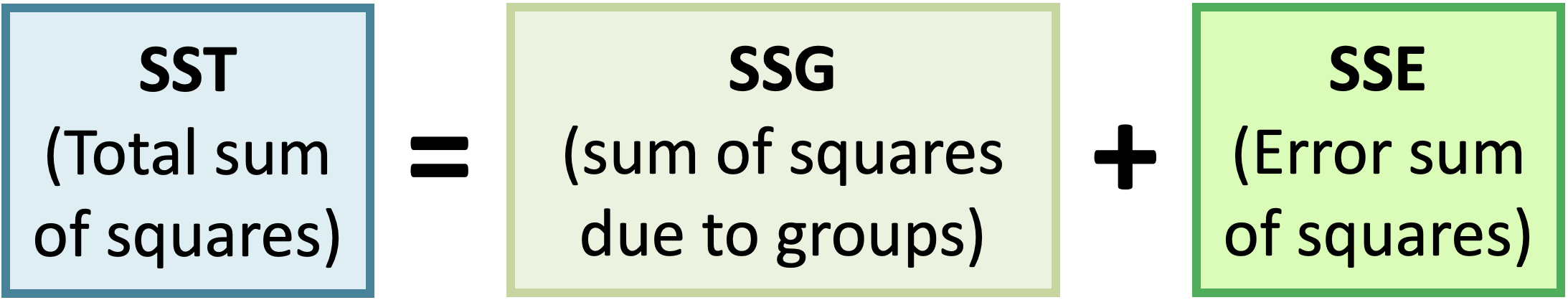 \[SSE = \sum_{i = 1}^k\sum_{j = 1}^{n_i}(x_{ij}-\overline{x}_{i})^2 = \sum_{i = 1}^k(n_i-1)s_{i}^2\] where \(s_{i}\) is the standard deviation of the \(i^{th}\) group