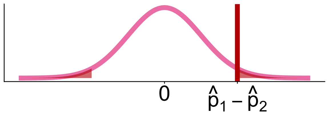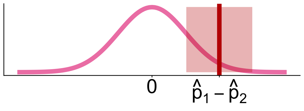 Sampling distribution of \(\hat{p}_1 - \hat{p}_2\): \[\hat{p}_1 - \hat{p}_2 \sim N \left(\mu_{\hat{p}_1 - \hat{p}_2} = p_1 - p_2, ~~ \sigma_{\hat{p}_1 - \hat{p}_2} = \sqrt{ \frac{p_1\cdot(1-p_1)}{n_1} + \frac{p_2\cdot(1-p_2)}{n_2}} \right)\]