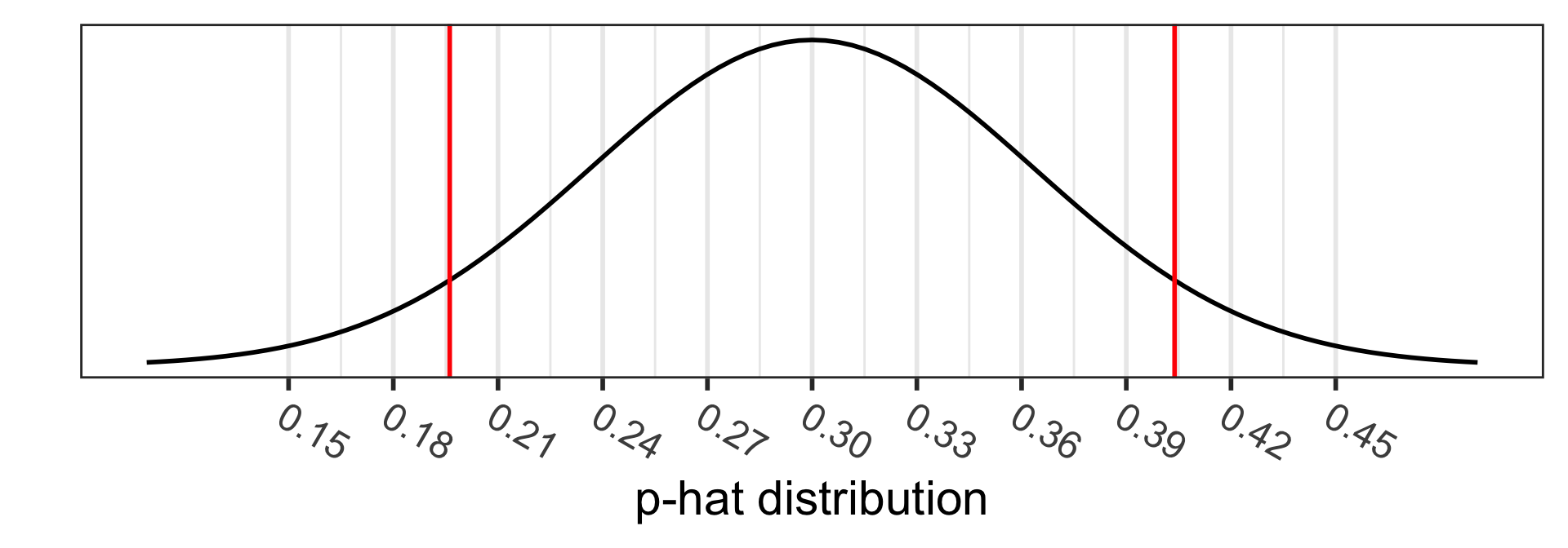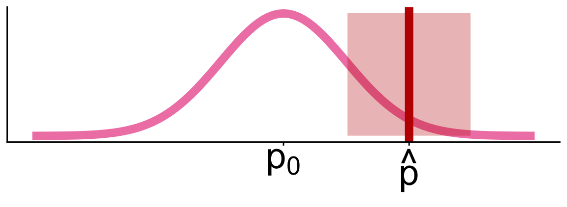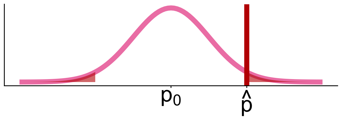 \[\hat{p} \sim N\left(\mu_{\hat{p}} = p, \sigma_{\hat{p}} = \sqrt{\frac{p(1-p)}{n}} \right) \sim N\left( \mu_{\hat{p}}=p_0, \sigma_{\hat{p}}=\sqrt{\frac{p_0\cdot(1-p_0)}{n}} \right)\]