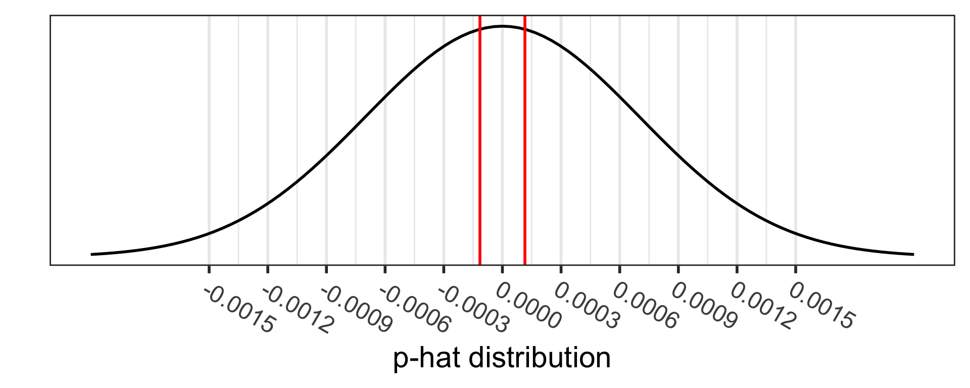 \[\begin{align} \hat{p}_1 - \hat{p}_2 &\pm z^* \cdot SE_{\hat{p}_1 - \hat{p}_2}\\ \hat{p}_1 - \hat{p}_2 &\pm z^* \cdot \sqrt{ \frac{\hat{p}_1\cdot(1-\hat{p}_1)}{n_1} + \frac{\hat{p}_2\cdot(1-\hat{p}_2)}{n_2}} \\ 0.01113 - 0.01124 &\pm 1.96 \cdot \sqrt{\frac{0.01113\cdot(1-0.01113)}{44925} + \frac{0.01124\cdot(1-0.01124)}{44910}}\\ 0.35 &\pm 1.96\cdot 0.001\\ 0.35 &\pm 0.002\\ (-0.002&, 0.002) \end{align}\]