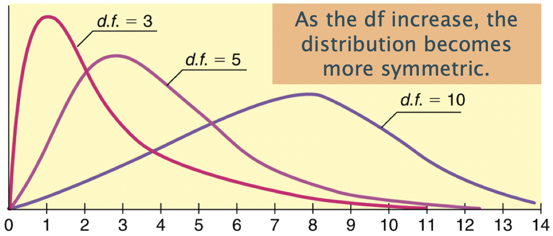 The \(\chi^2\) distribution shape depends on its degrees of freedom