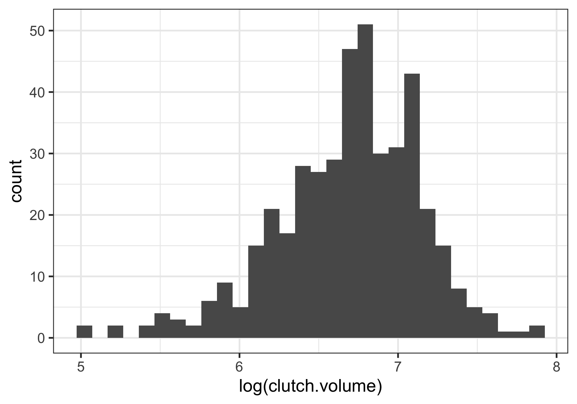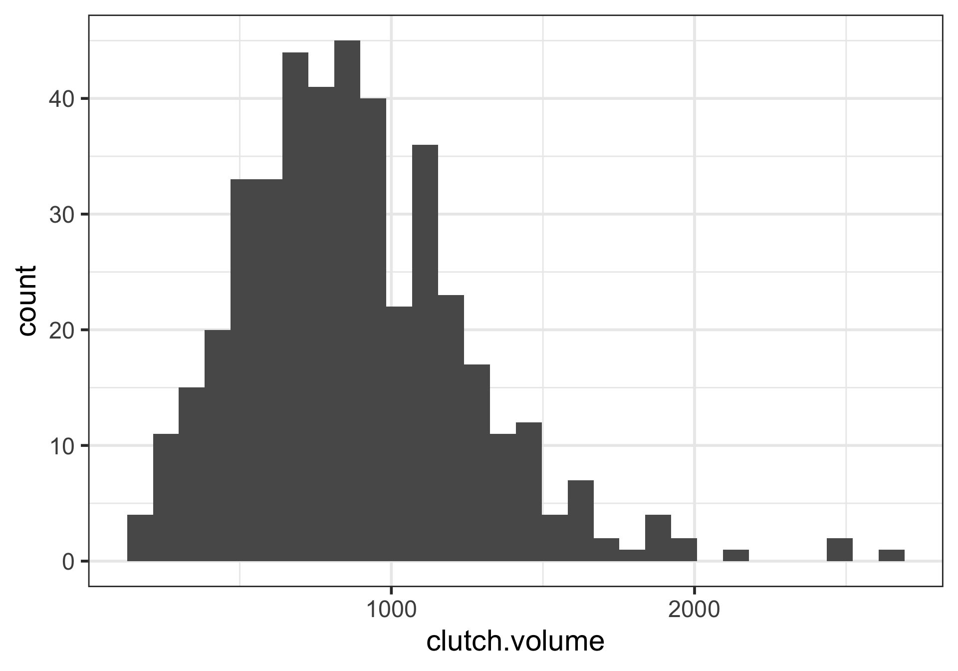 We will be working with the frog dataset, which originates from a 2013 study2 about maternal investment in a frog species. Reproduction is a costly process for female frogs, necessitating a trade-off between individual egg size and total number of eggs produced.