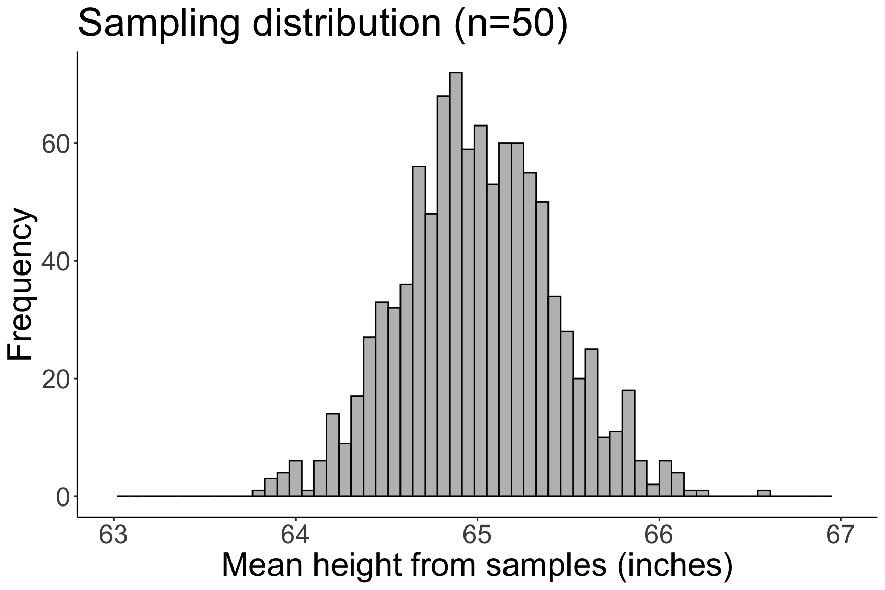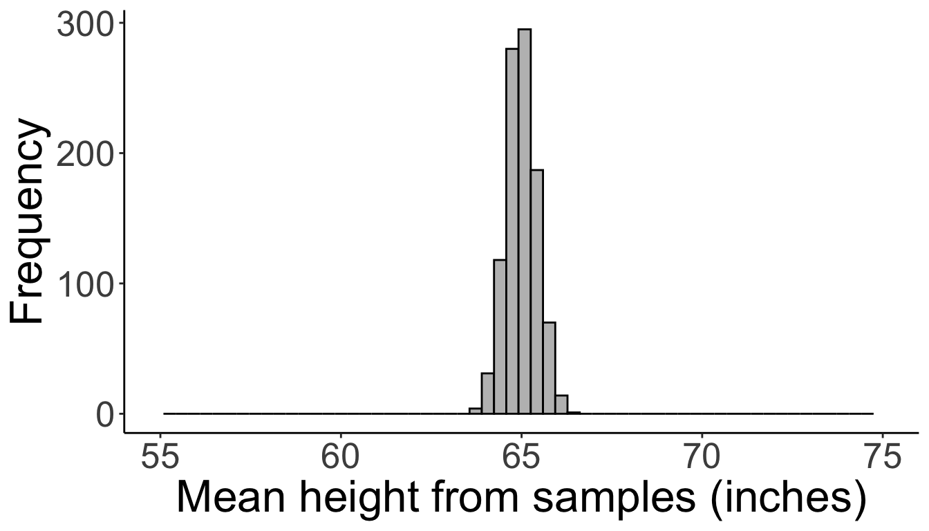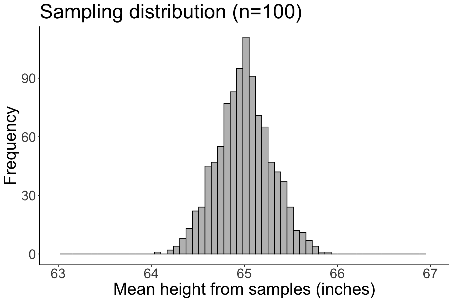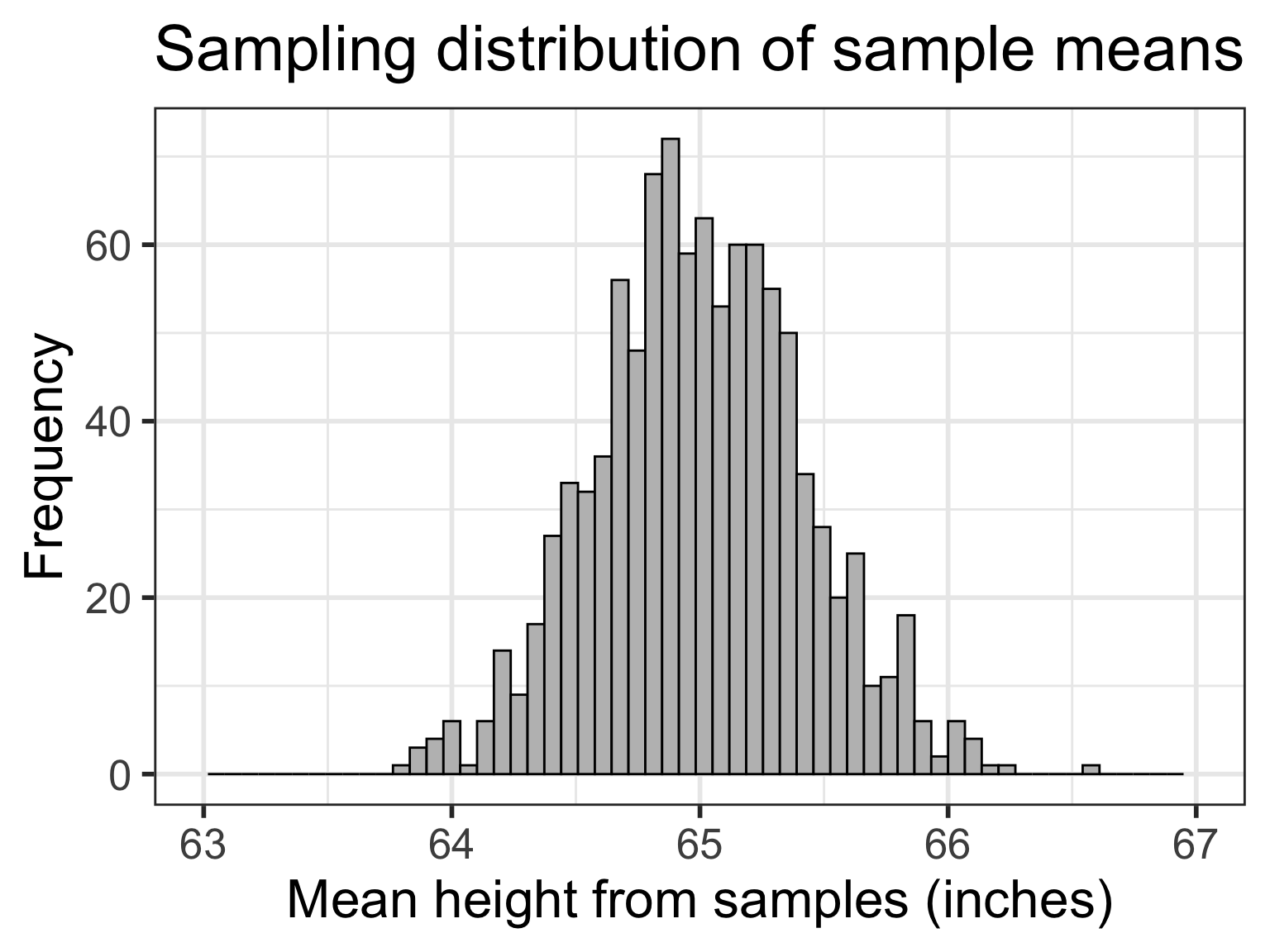 \[ \mu_{\overline{X}} = 65.002 \text{ inches}\] \[ SE = 0.421 \text{ inches}\]