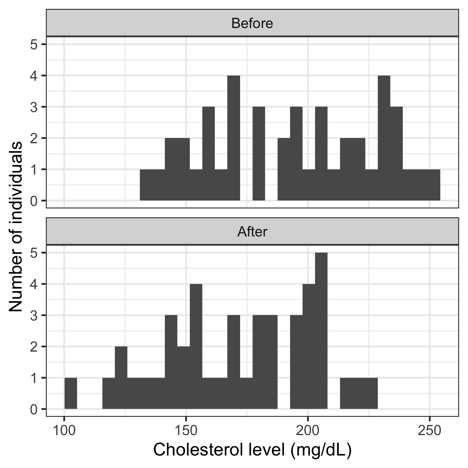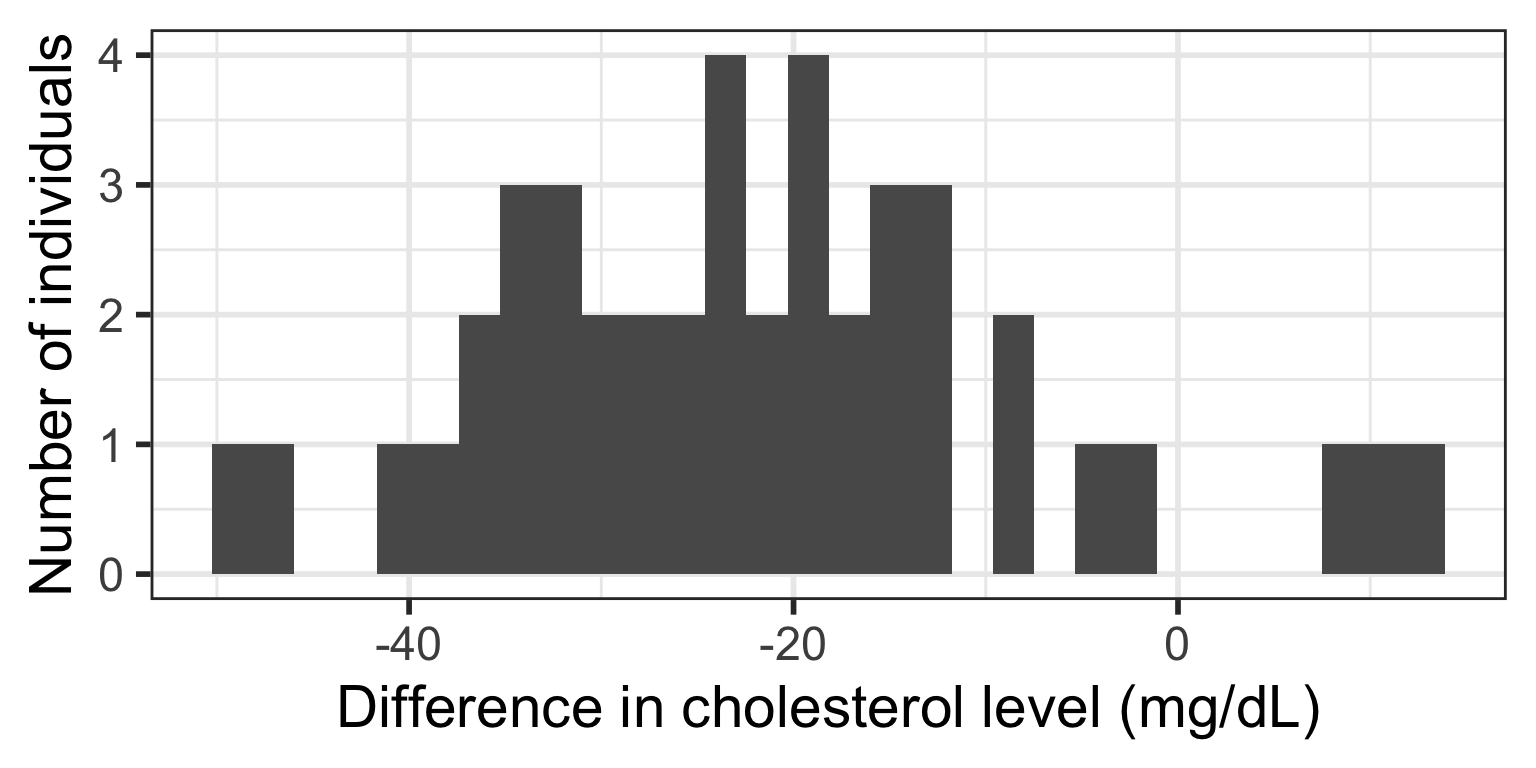 \[\begin{aligned} H_0 :& \text{The population mean difference in cholesterol levels after a vegetarian diet is zero}\\ \text{vs. } H_A :& \text{The population mean difference in cholesterol levels after a vegetarian diet is} \\ & \text{ different than zero} \end{aligned}\]Notation for hypotheses (for paired data)