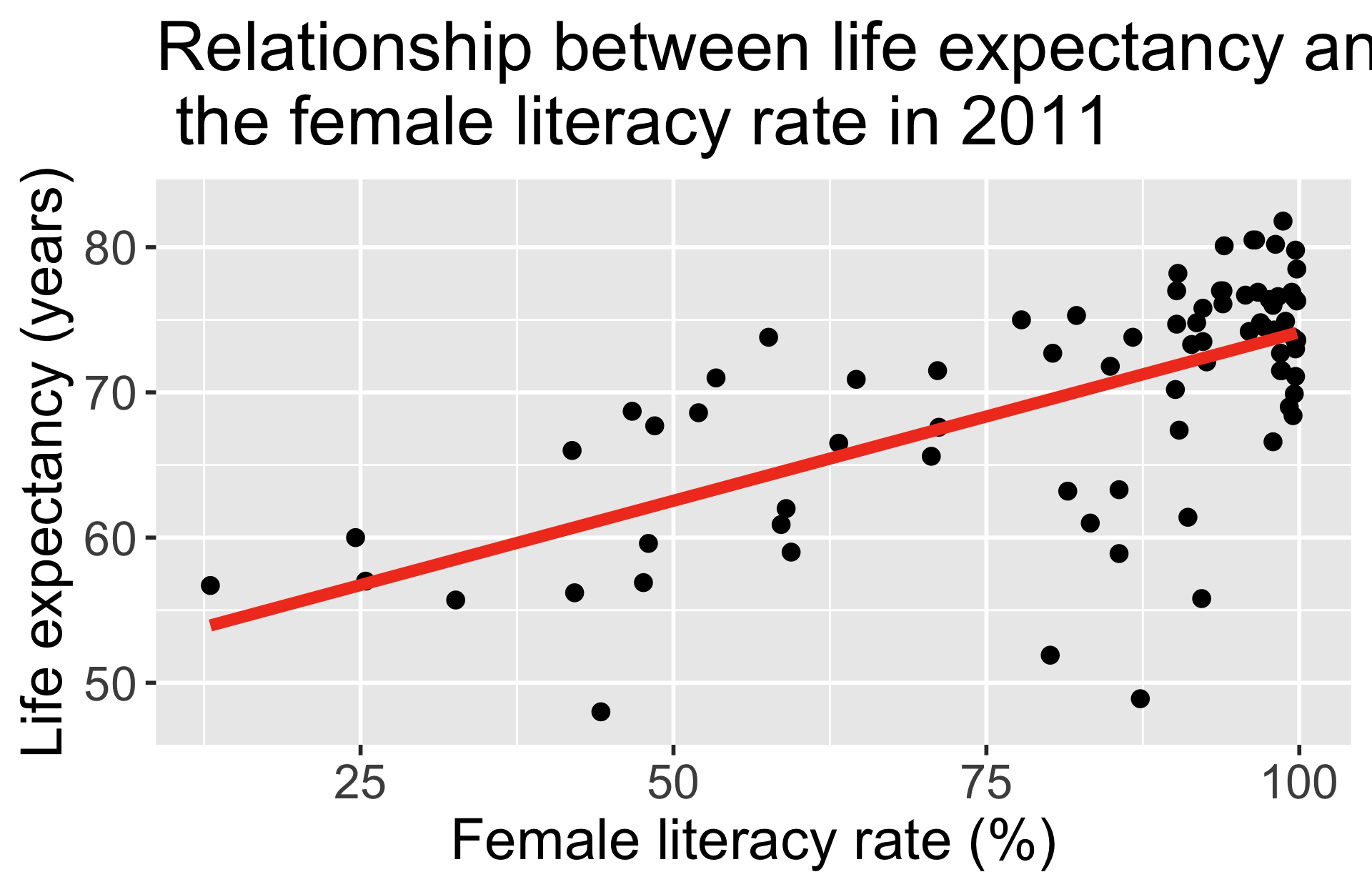 \[\widehat{\text{life expectancy}} = 50.9 + 0.232\cdot\text{female literacy rate}\]