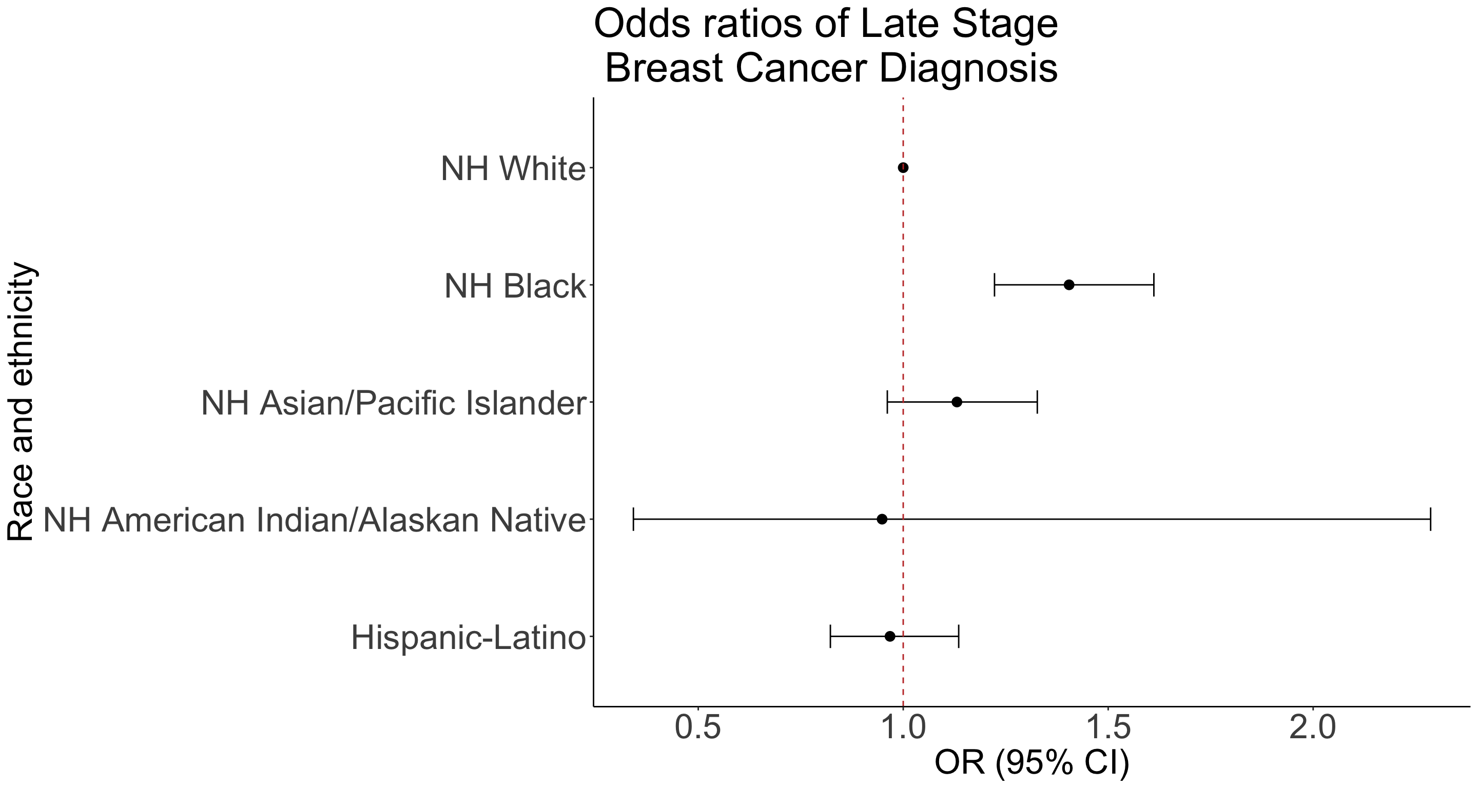 title = "Odds ratios of Late Stage \n Breast Cancer Diagnosis") +