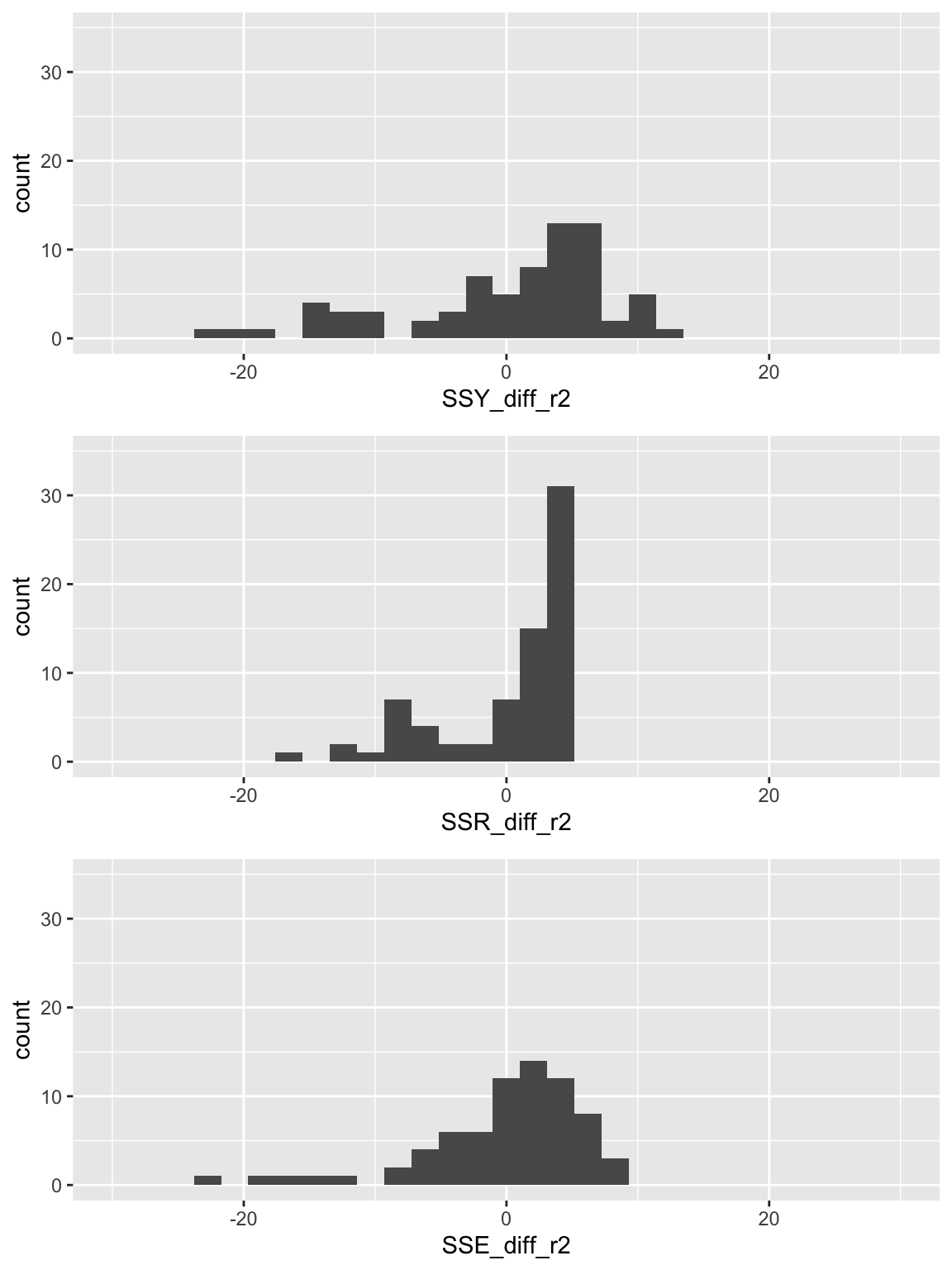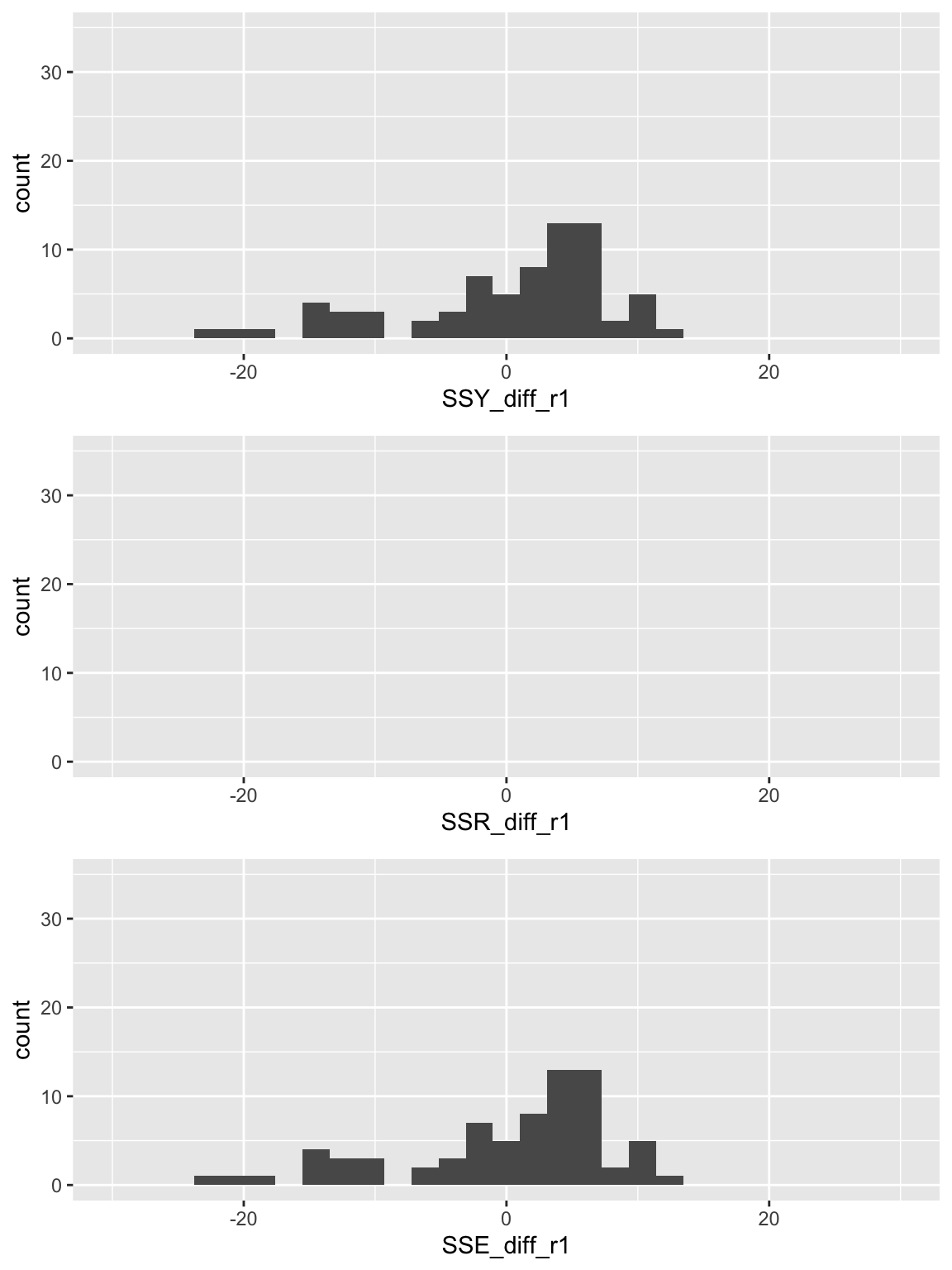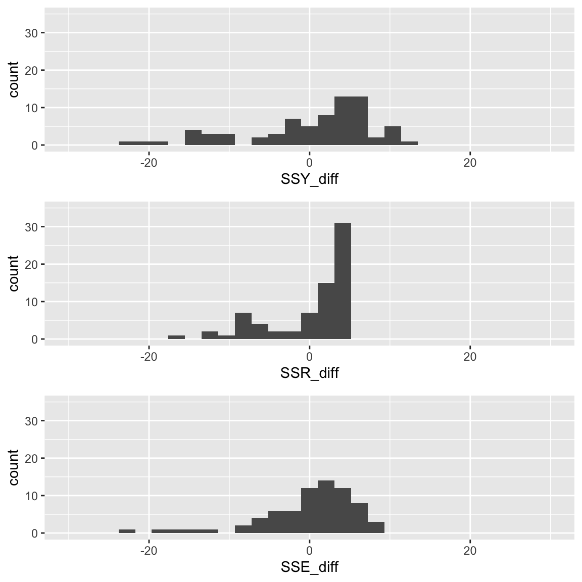 SSE_diff = aug_slr1$.resid)SSY_plot = ggplot(SS_df, aes(SSY_diff)) + geom_histogram() + xlim(-30, 30) + ylim(0, 35)