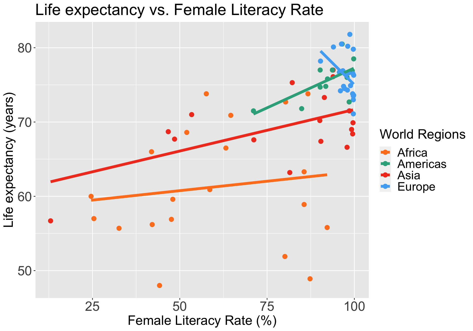 Questions of interest: Does the effect of female literacy rate on life expectancy differ depending on world region?
