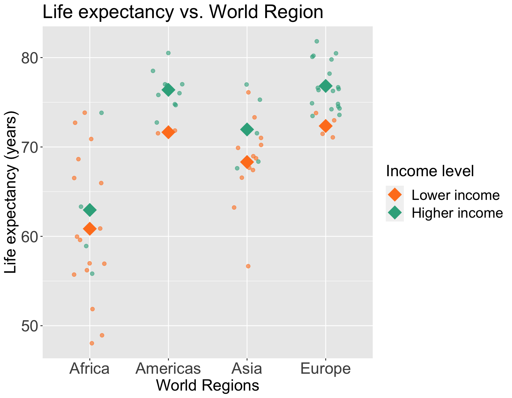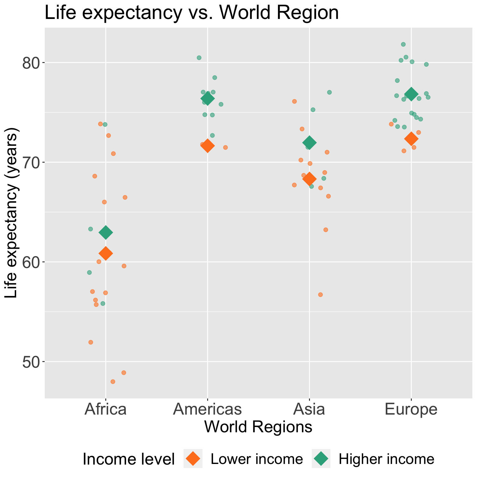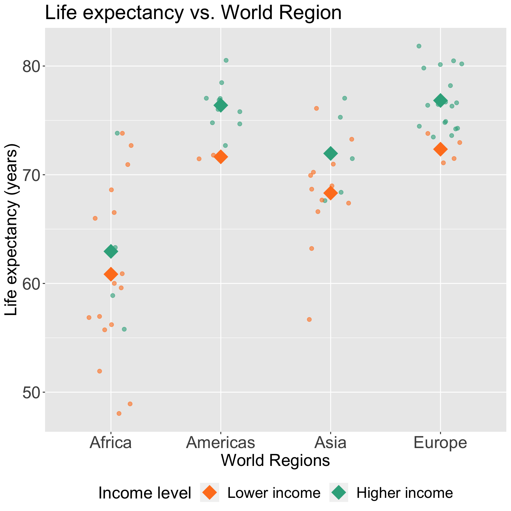 We can start by visualizing the relationship between life expectancy and world region by income level