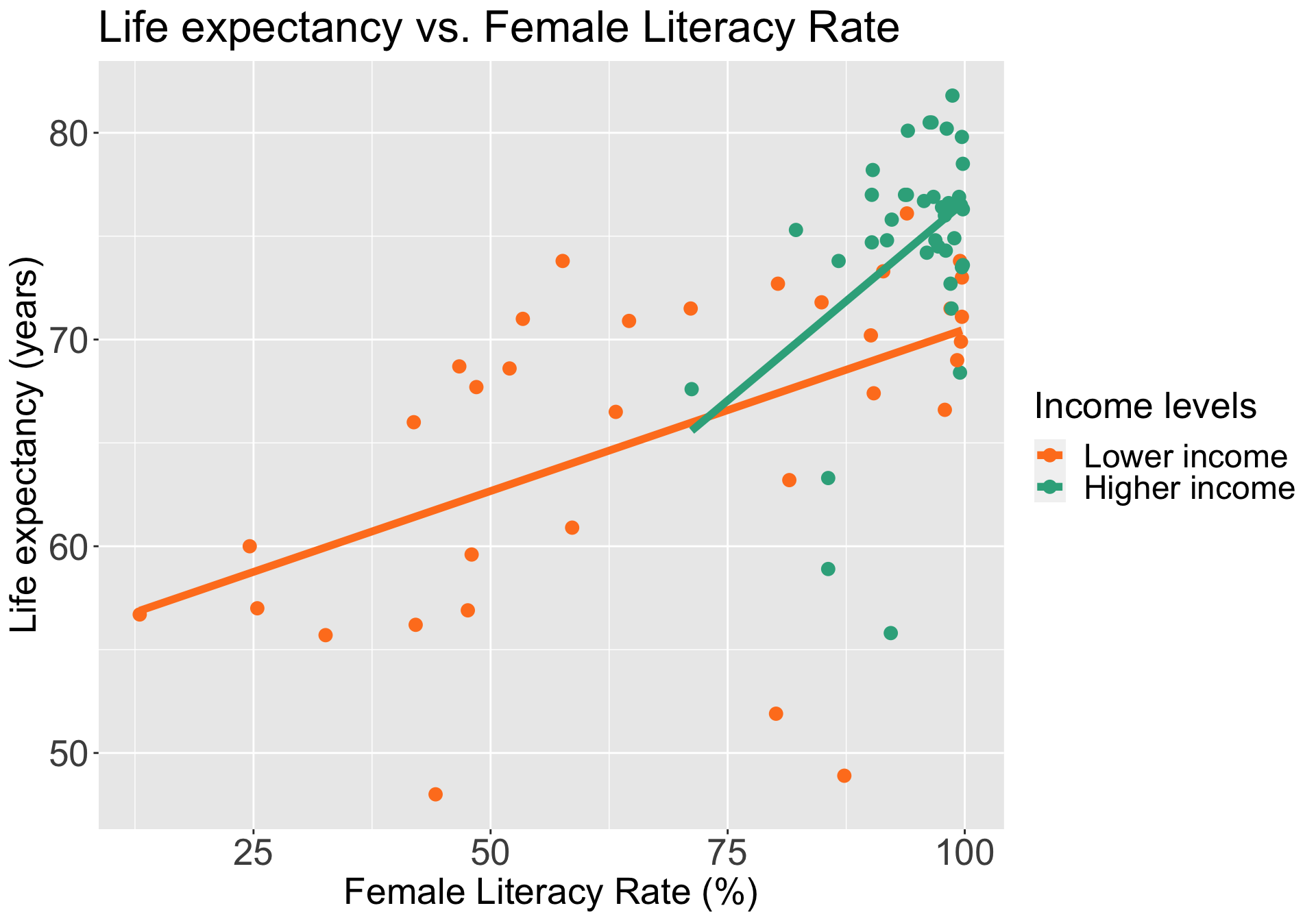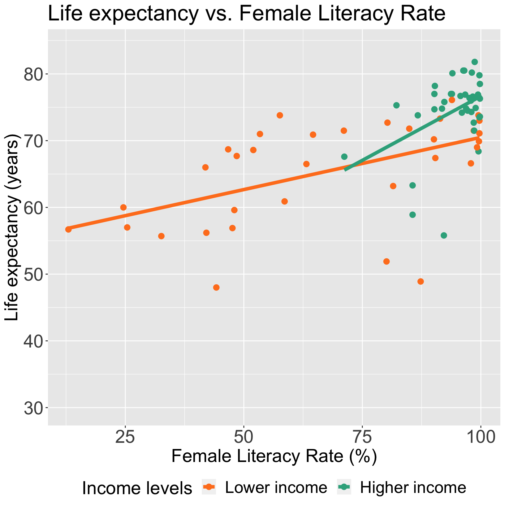 We can start by visualizing the relationship between life expectancy and female literacy rate by income level