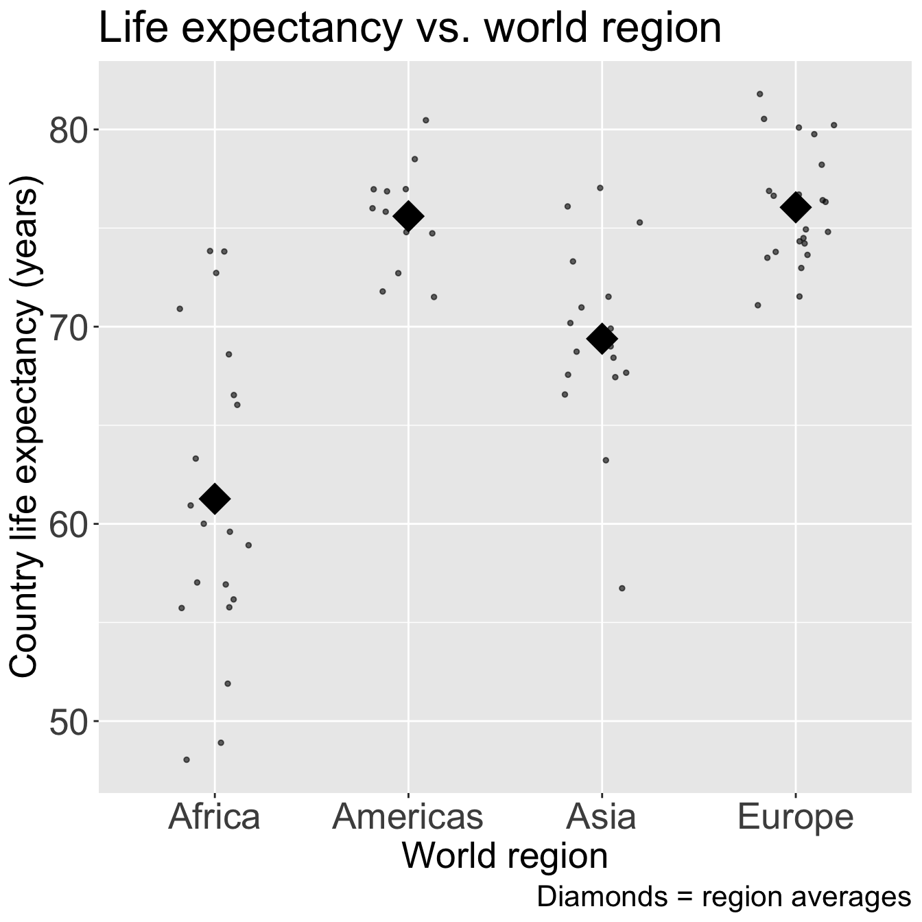 caption = "Diamonds = region averages") +