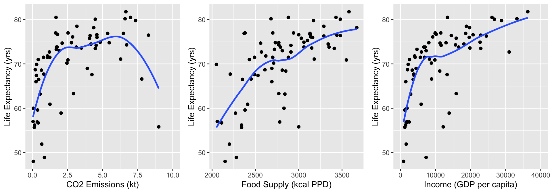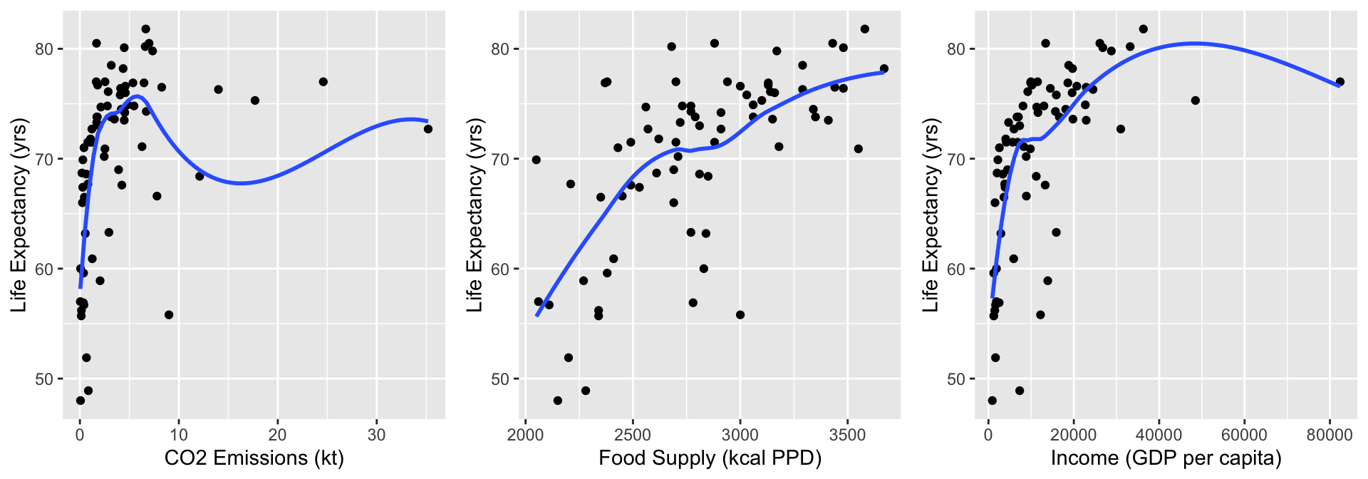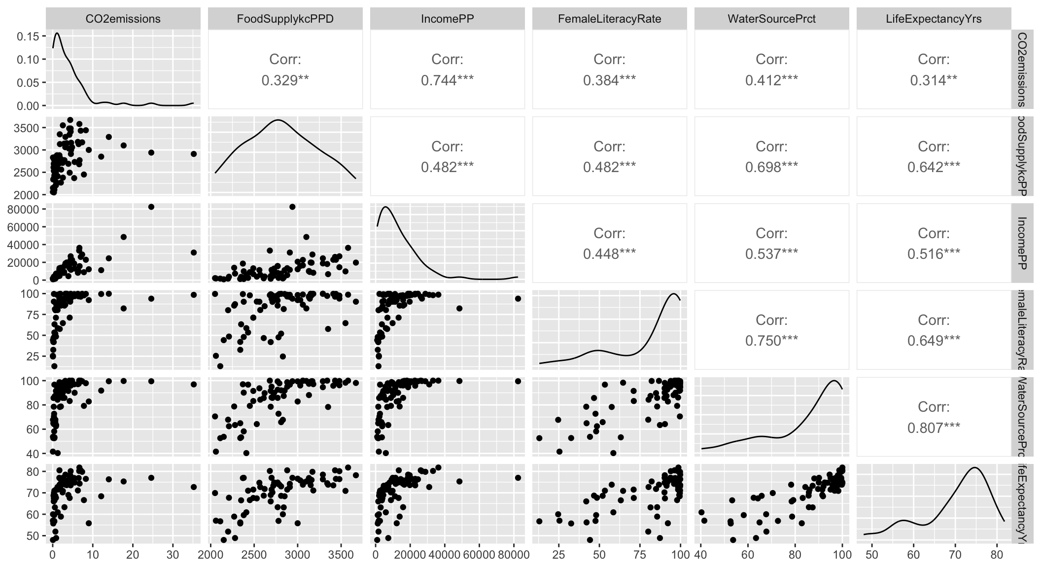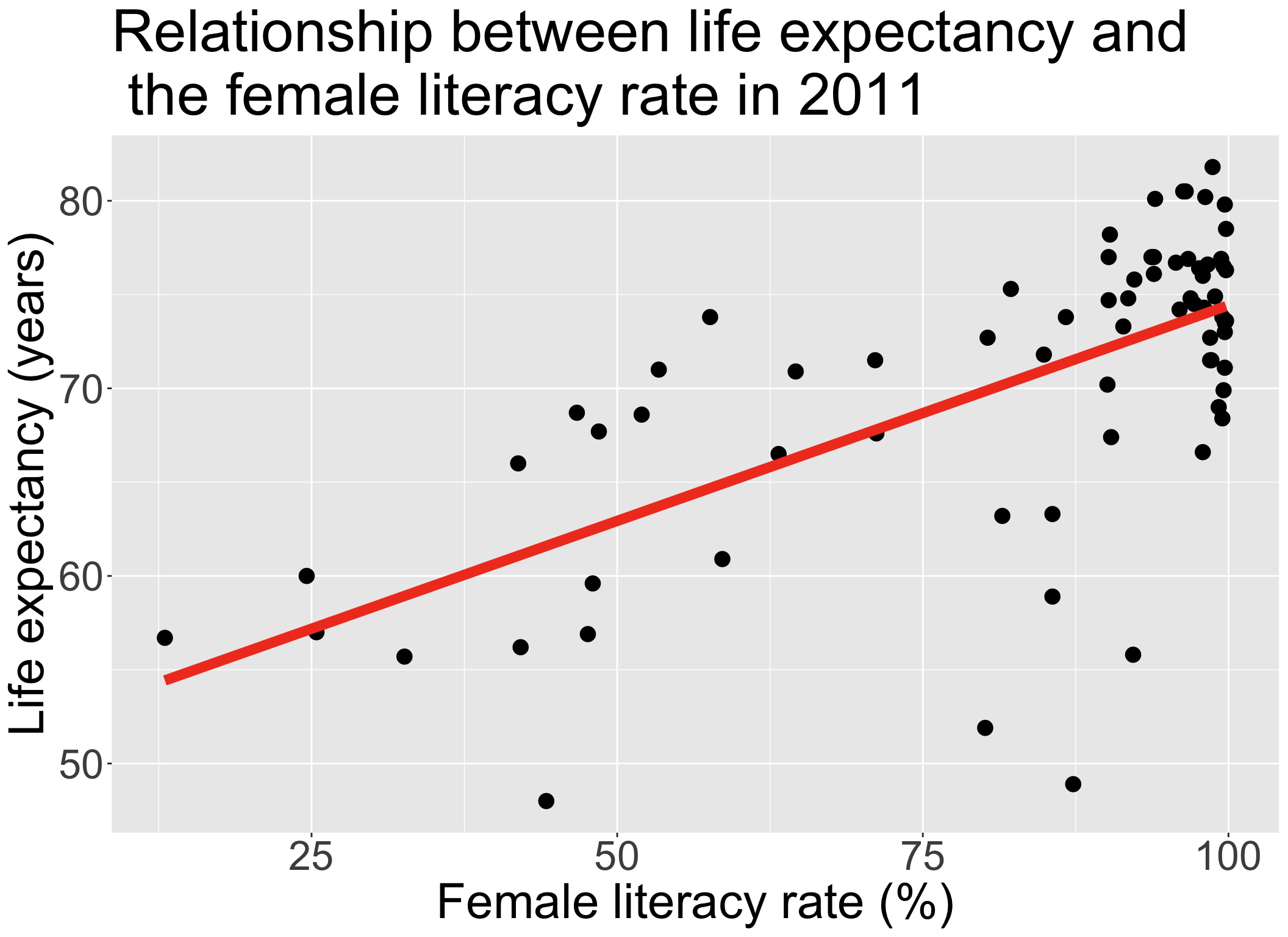 Always good to start with our main relationship: life expectancy vs. female literacy rate